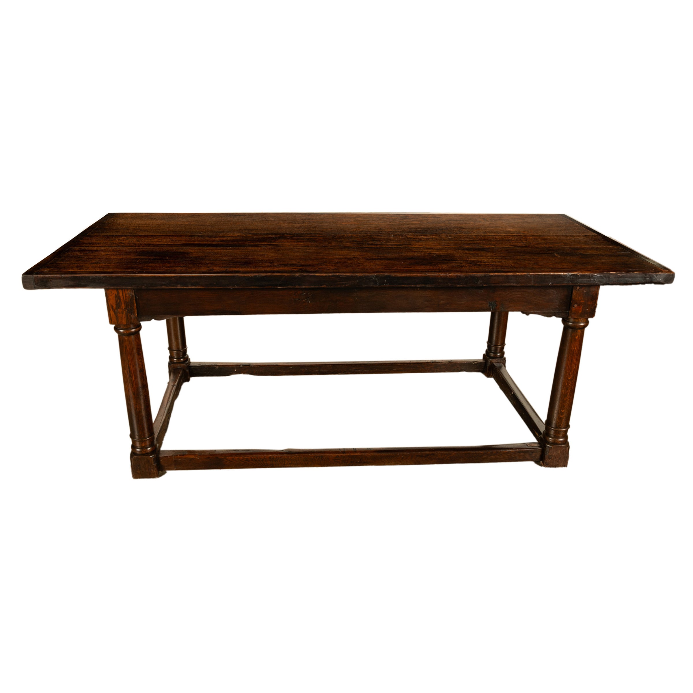 The table with a splendid rectangular top of three boards with a rich deep honey color patina created over almost 400 years. The table apron with a small carved bracket to each corner, raised on four ring turned 'cannon barrel' legs, joined by plain stretchers and terminating to block feet. The table top with a deep overhanging top, the table is in very good condition, it is very sturdy & robust, color is a deep warm honey patina to both the base & top.