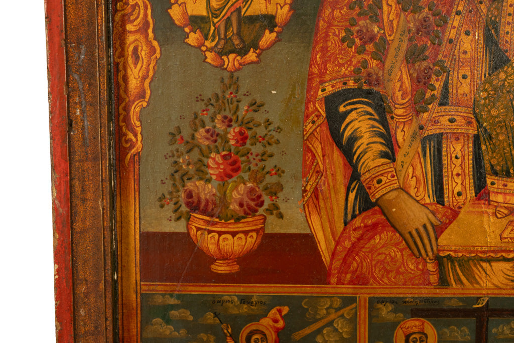 The icon with a central figural group of the Virgin & Jesus, the heavens above them with God & Jesus looking down, flanked with angels seated on clouds. The Virgin is surrounded by saints in gilded cartouches with Greek caligraphy, the Virgin also with a long ribbon with Greek caligraphy. The base with four panels; the two central panels with the true cross to the center held by a pair of saints. In each corner to the base is the patron Saint George, killing the dragon and to the right the patron Saint Demetrius of Thessaloniki.