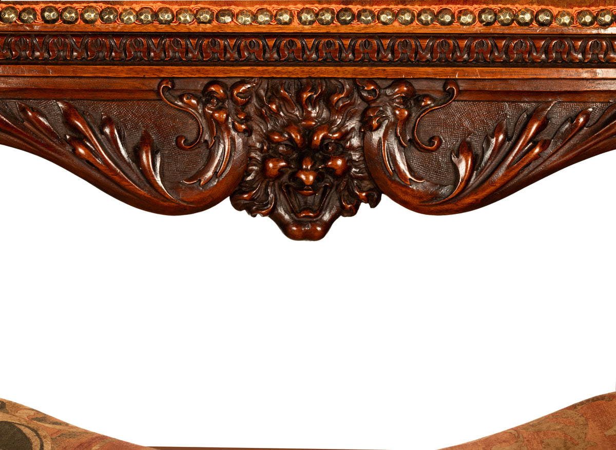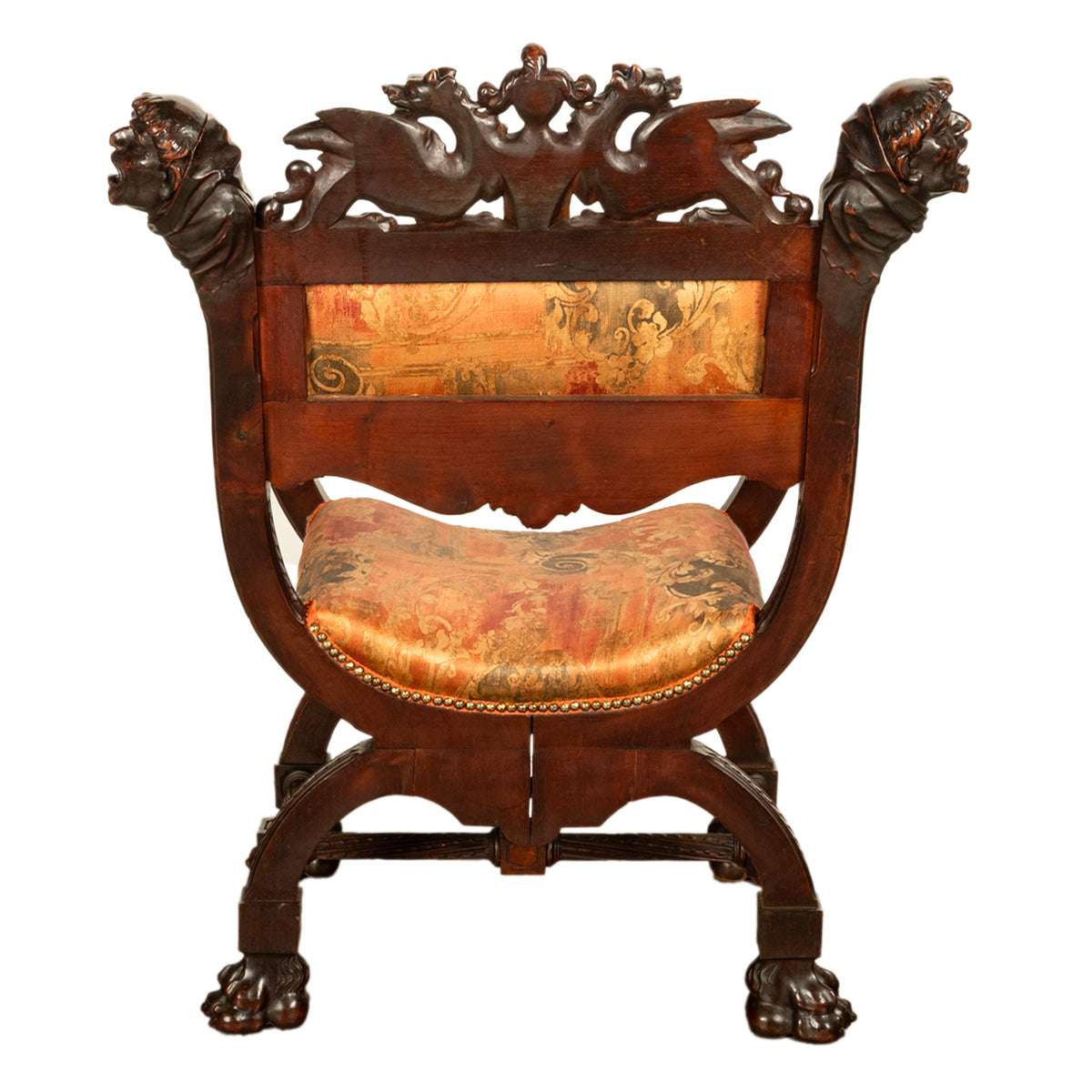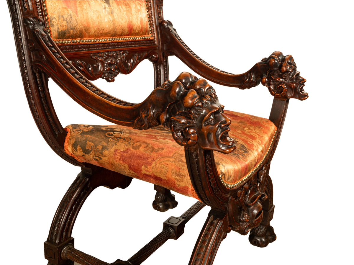 The back having an upholstered head rest with stylized acanthus leaf carving with a carved mask to the center, the chair is upholstered in a high quality gold fabric with a scrolling leafy pattern. The curved arms terminate with carved dragon's claws resting on grotesque heads with ram's horns, the seat is of X-frame or Curule shape, the lower front of the seat having a carved knight's helmet flanked with a pair of halberds or battle axes.