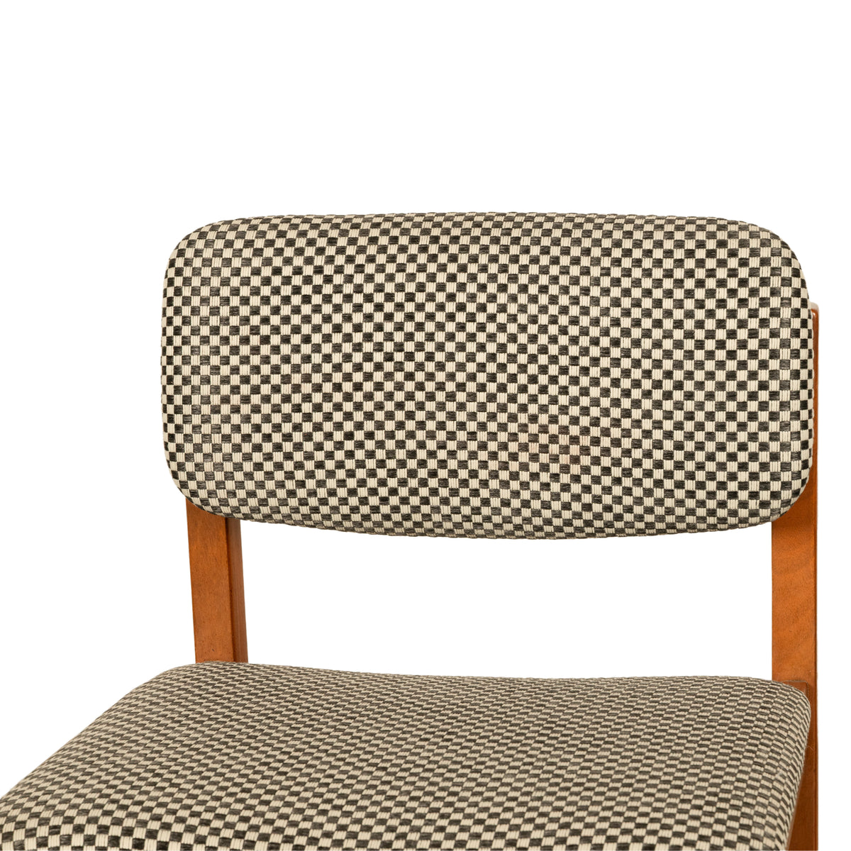 The chairs have just been professionally reupholstered in a very high quality black & cream checkerboard fabric. The floating backs above a slightly curved seat, the square legs with a ribbed edge moulding and a single stretcher bar to the back. The chairs are very comfortable and provide great lumbar support for one's back, condition is very good, the chairs are sturdy and robust, the teak has been polished in Bloomsbury's workshops and the upholstery is fresh, this very stylish set of four Danish MCM chairs are ready to grace your table. Jens Risom was a Danish American designer and a pioneer introducing Scandinavian design in the United States, he studied at the Copenhagen School of Industrial Arts & Design with other such design luminaries as Hans Wegner & Børge Mogensen.