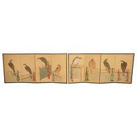 Wonderful pair of four-panel byôbu 屏風 (folding screens) covered with four separate hanging scroll paintings 掛け軸 (kakejiku) depicting different taka 鷹 (hawks) perched & tethered different seasons. The painting is of the highest quality and portrays the bird's distinct features; sharp beaks, keen eyes, long curving talons. Falconry, hunting with hawks bred in the countryside was practiced in Japan from ancient times. As a sport it is thought to have come to Japan from China as early as the fourth century. During the Edo Period, it was patronized by the Shogunate, and an official Imperial master falconer was appointed.