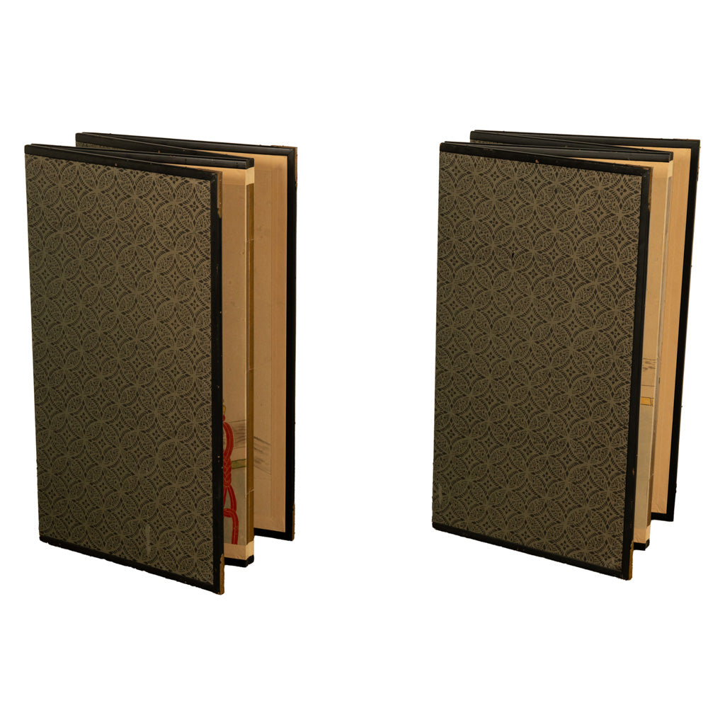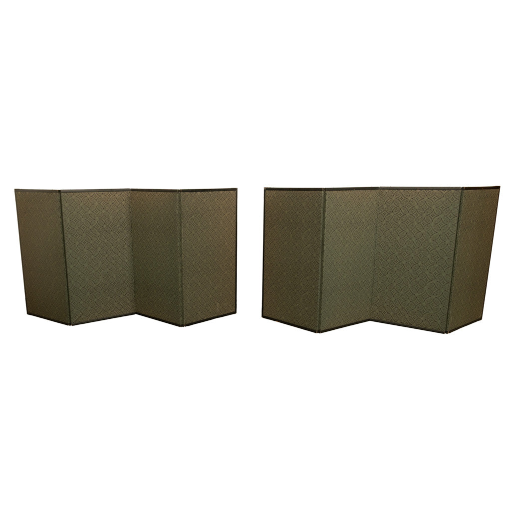 The paintings are mainly done in black ink with polychrome details on a paper ground, and protected by a black lacquer frame with its original hardware, each screen has a geometric brocade backing.
