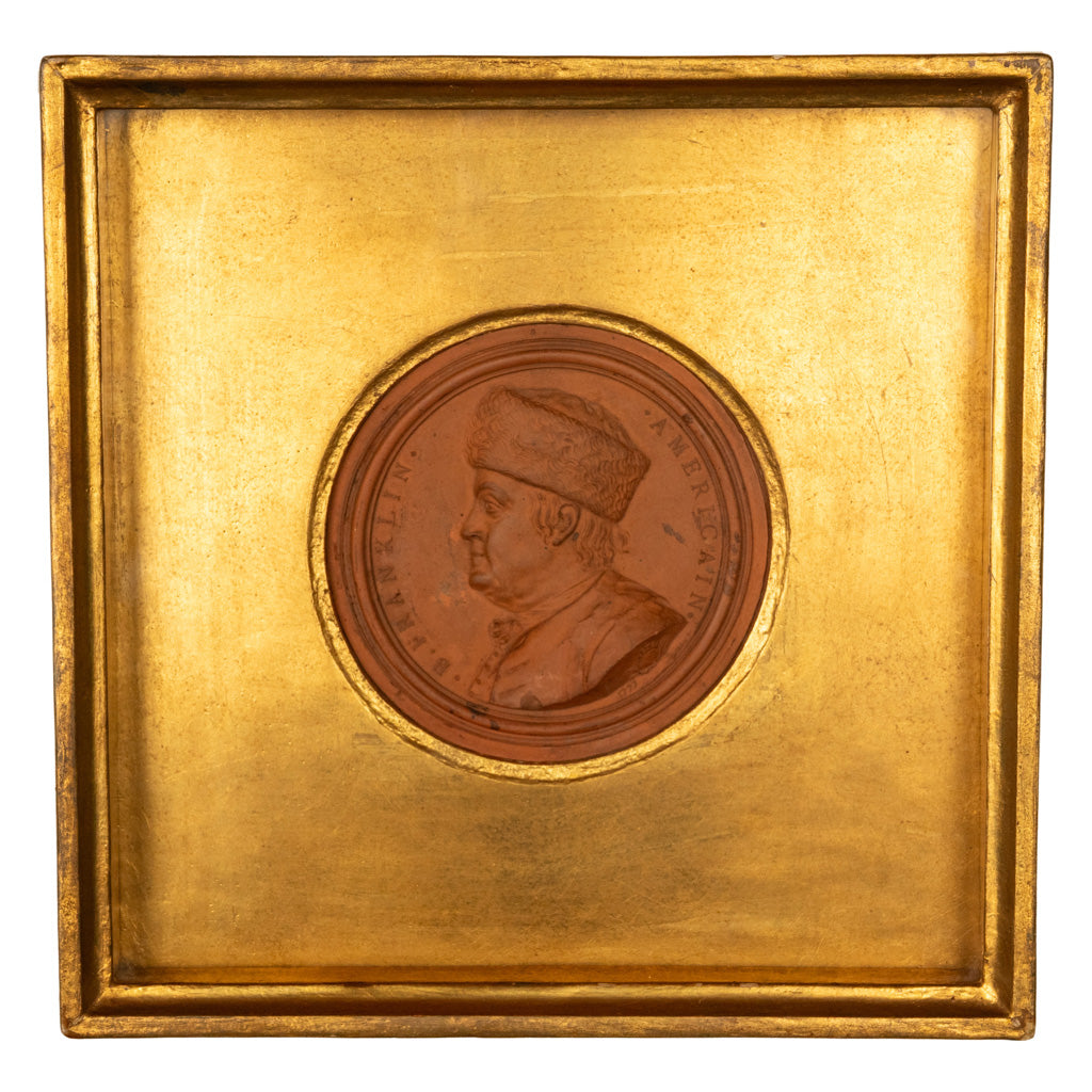 A profile portrait-relief of Benjamin Franklin wearing his signature fur hat within a circular terracotta medallion. The upper surface of the medallion reads: "B. FRANKLIN / AMERICAIN" around the image. Impressed on the tranche of the sitter’s shoulder "Nini / F1777" has been engraved, with an additional "1777" repeated below. A relief shield has been rendered to the right of these inscriptions; the shield is emblazoned with a lightning rod and thunderbolt and surmounted by a crown.