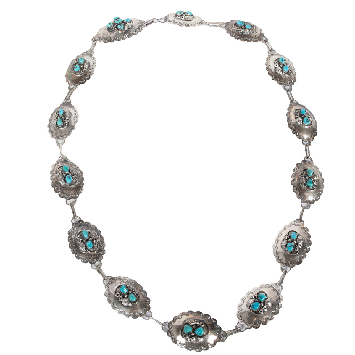 This very attractive Navajo belt is made up of oval silver discs with tooled & pressed floral outlines, each oval disc is adorned to the center with silver curls & leaves and inlaid with polished blue turquoise cabochons. The belt is a little over 36" in length and is very sturdy and well made, the links are solid, the belt is in excellent condition and ready to wear.