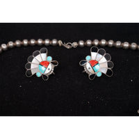Burdian Eustace of Zuni Pueblo crafted this Zuni Sun Face suite of sterling silver with small sections of carefully cut jet, white mother of pearl, turquoise and red shell. The Zuni sunface is a representation of the sun—giver of life and warmth. The sun is responsible for all life and the sunface design is found in jewelry and pottery.