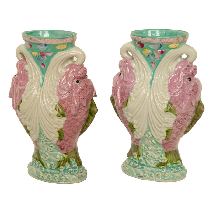 Pair Antique Chinese Qing Dynasty Wucai Glaze Porcelain Double Dragon Fish Vases, 1890