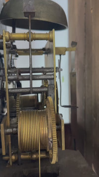 The clock is housed in the original carved oak case, both the hood and the body of the case is finely carved with floral & foliate carving, the hood door reveals a brass dial with Roman numerals & a subsidiary seconds dial, decorated cast brass spandrels to each corner with female masks. The clock having a circular raised boss to the top signed "Gulielmus Dickinson", the base is also signed "George Brownless Staindrop". Above the signature is an engraved fruiting basket with a calendar aperture below, to keep track of the date. The clock having an eight day time & strike mechanism; chiming out the hours on a mellow sounding bell.