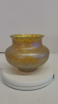 The vase with a wide flared neck & a bulbous body and raised upon a circular foot, the vase with iridescent all over patches of silver-gold 'oil spot' decoration.