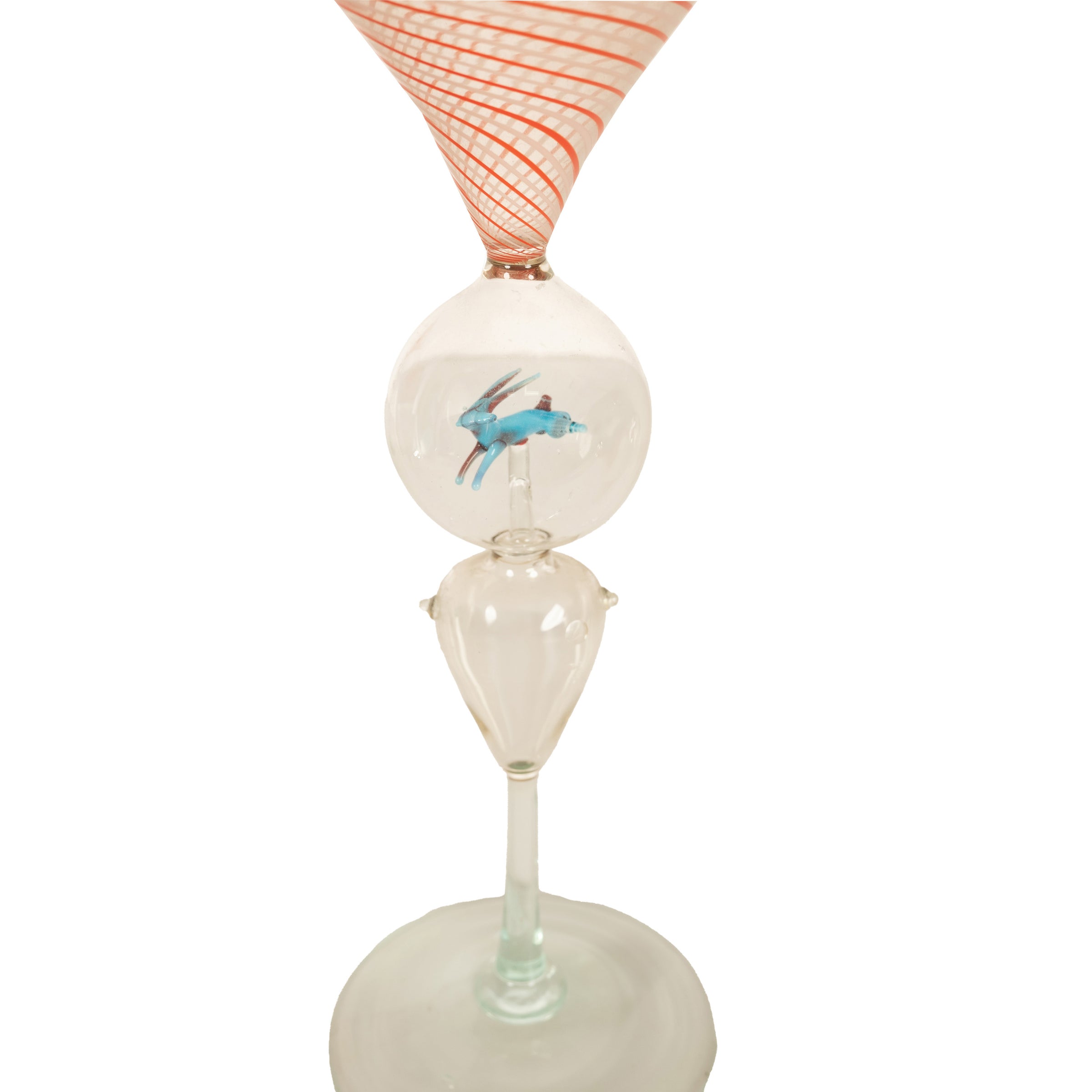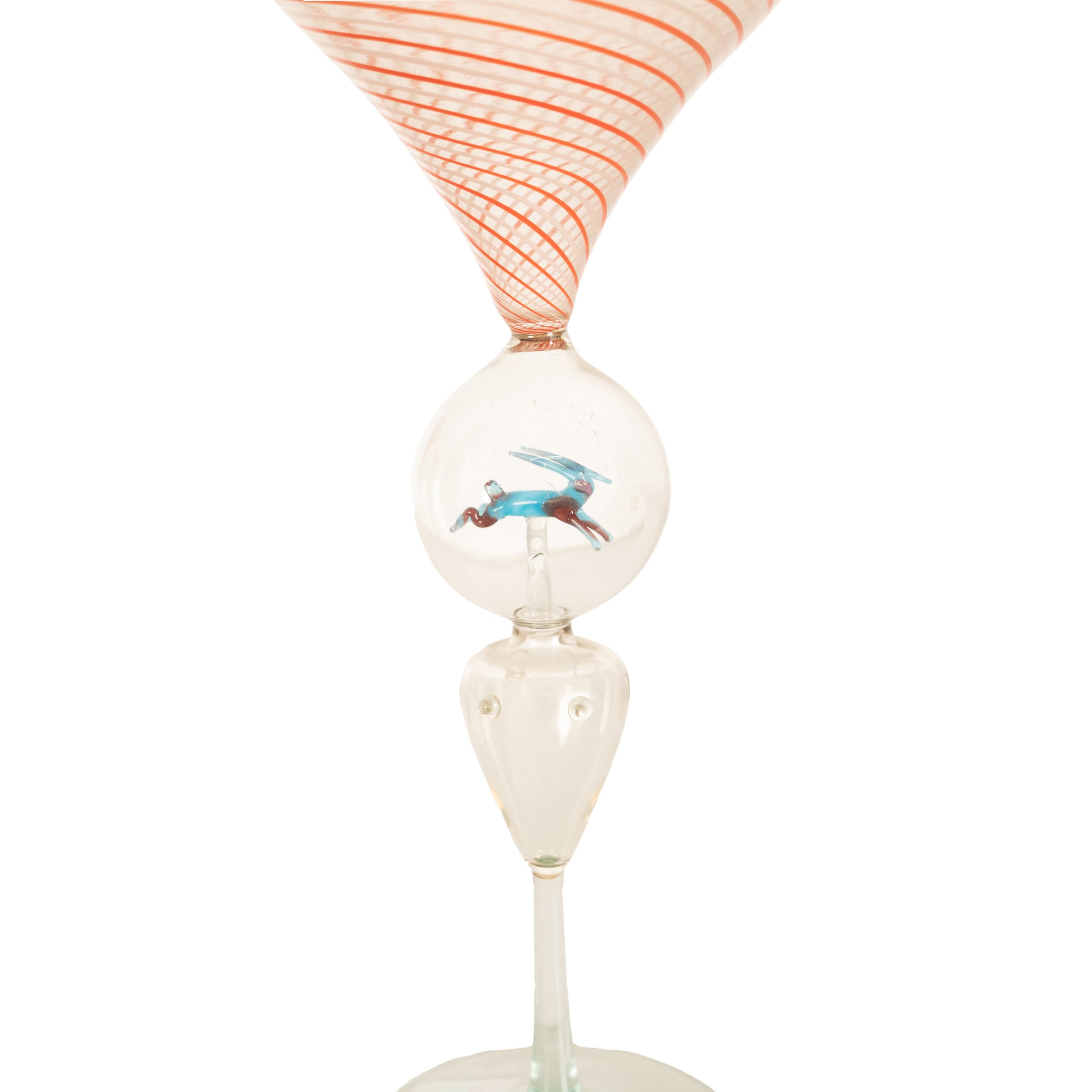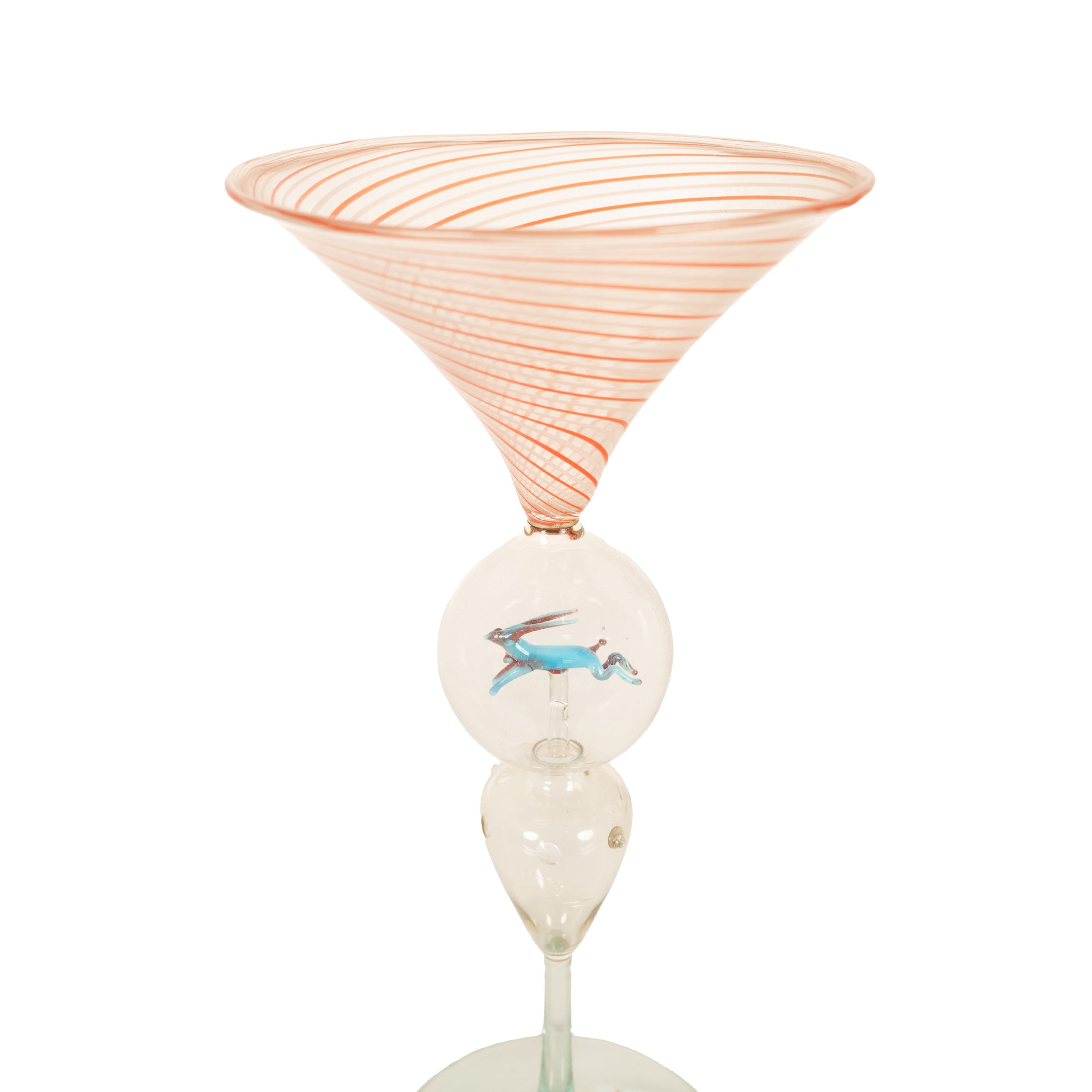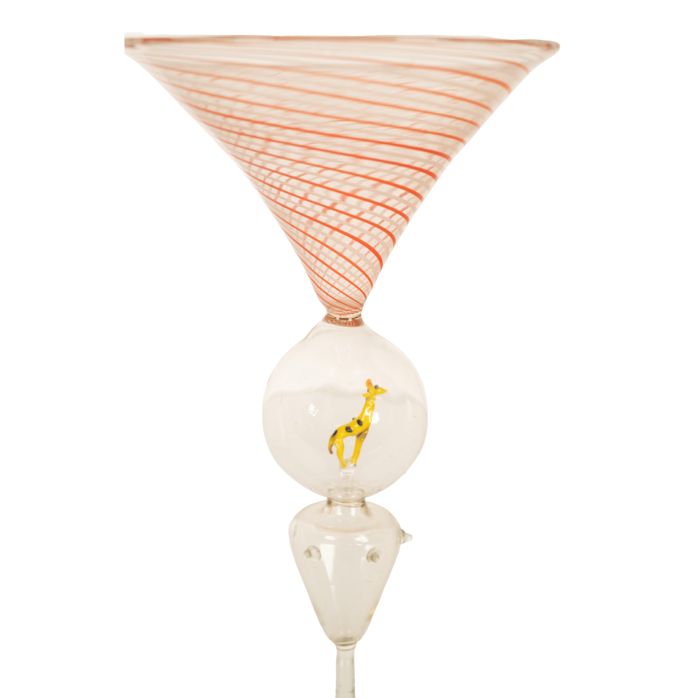 A very playful set of martini glasses by the Bimini glassworks in Vienna. The glasses are handblown, the bowls are internally decorfated with red spiral glass canes, below is a bubble, and each bubble has a small colorful animal inside. Below is a second enlongated bubble decorated with raised prunts, each glass is raised on a reverse tapered stem terminating to the flared circular foot.