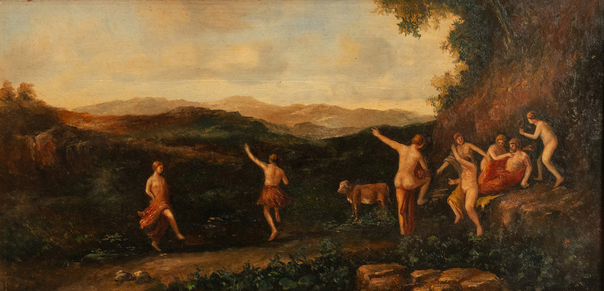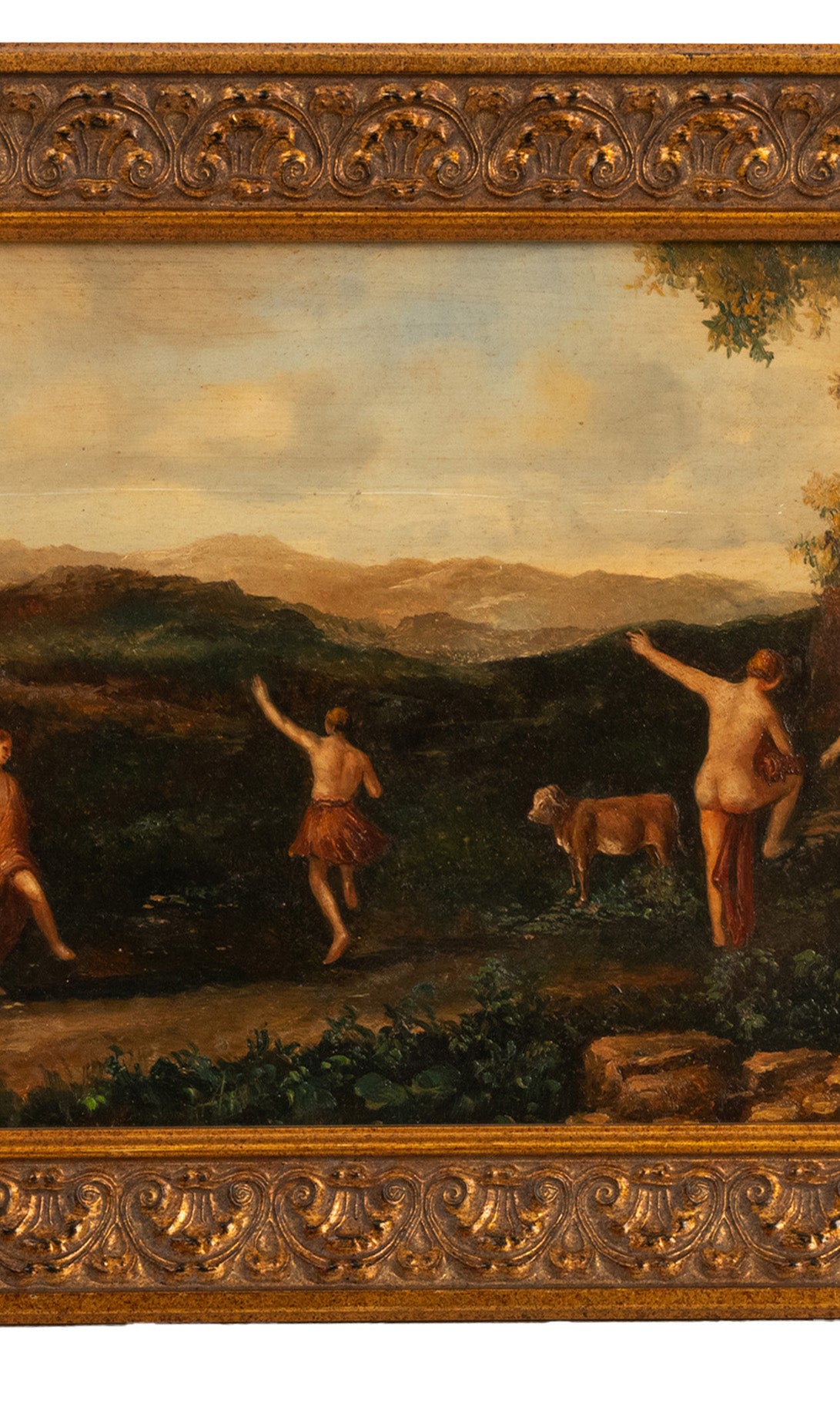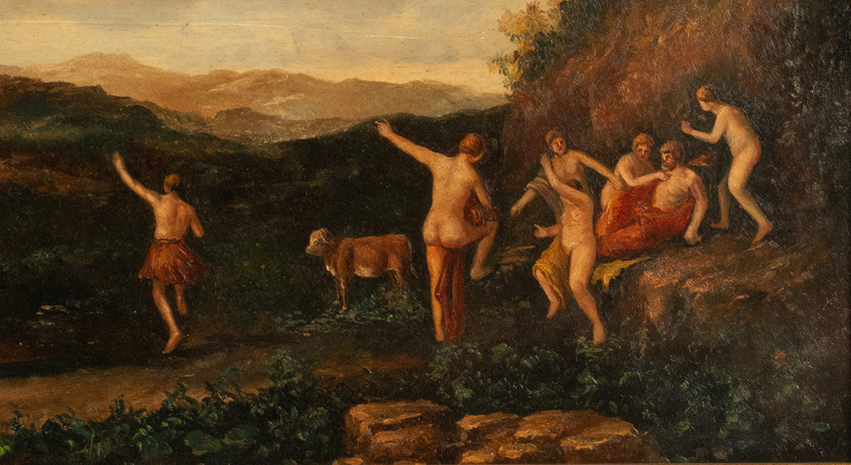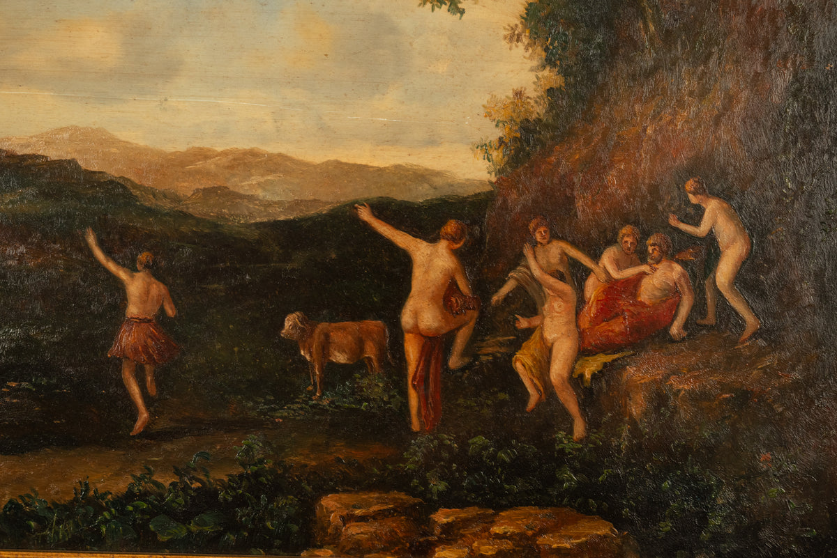 Antique 19th Century Neoclassical Bacchanal Oil Painting Dancing of the Nymphs 1850 after Cornelis van Poelenburgh
