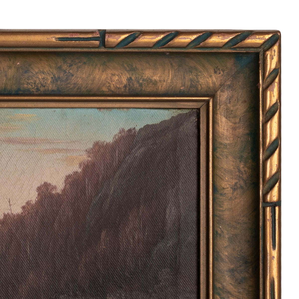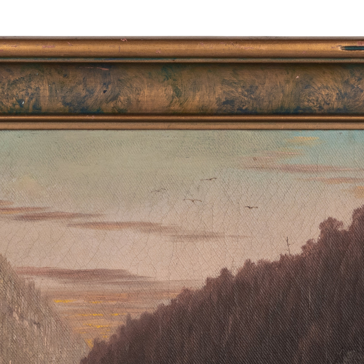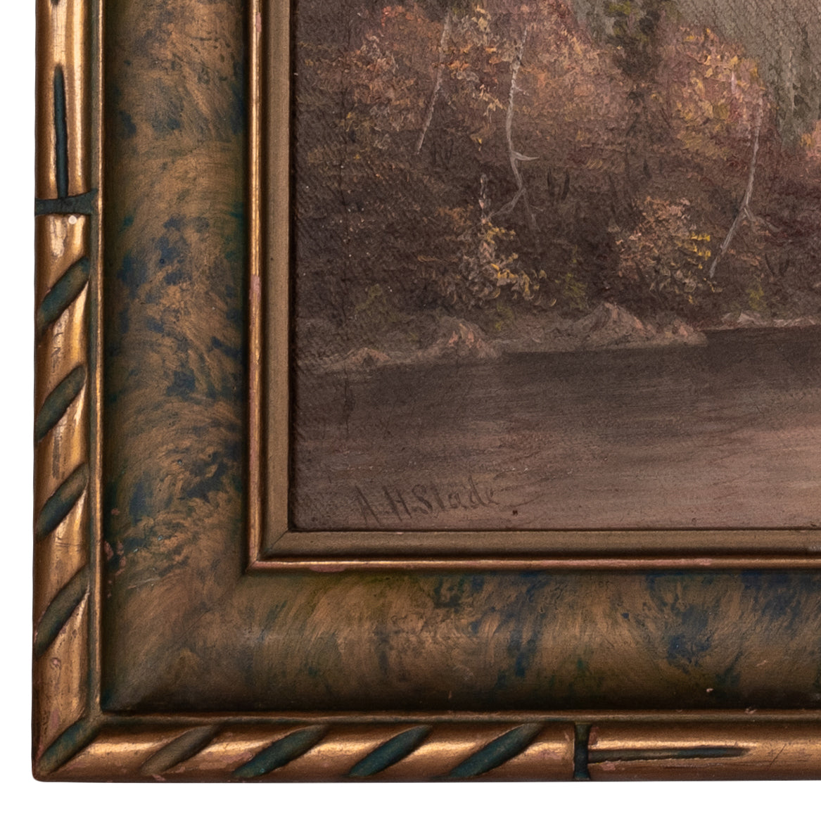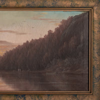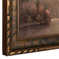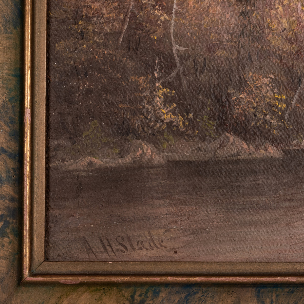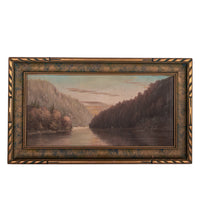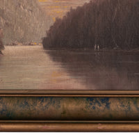 The painting depicts a river through a mountainous, forested river landscape, there are several figures by the river bank, one with a fishing pole and a canoe/boat, the painting is signed lower left "A. H. Slade". The painting is housed in the original gilded and sponge decorated frame, a little expected craquelure to the surface, the painting in good original condition.