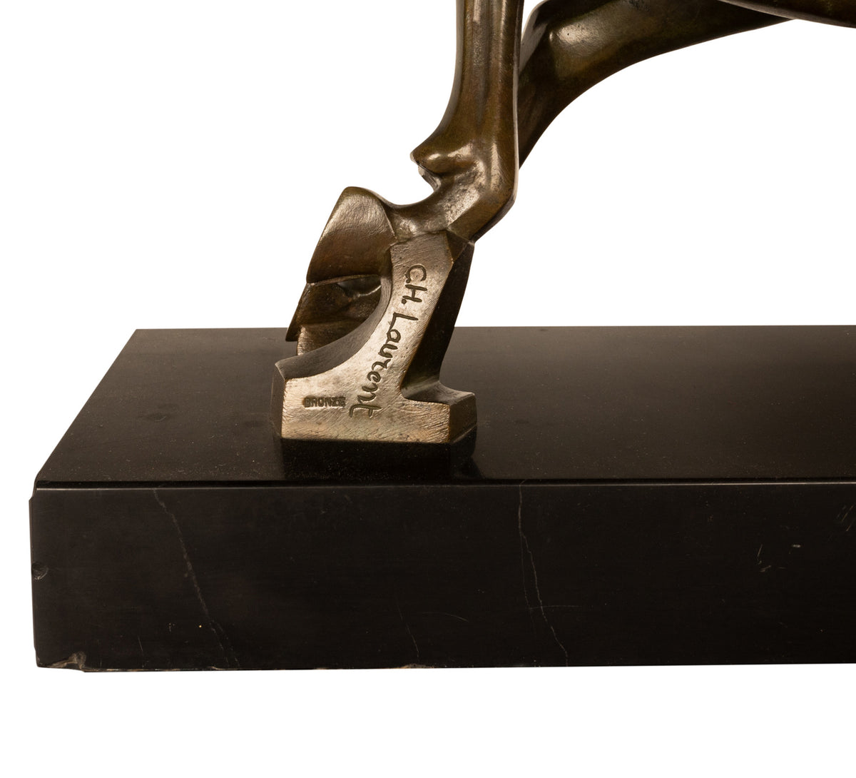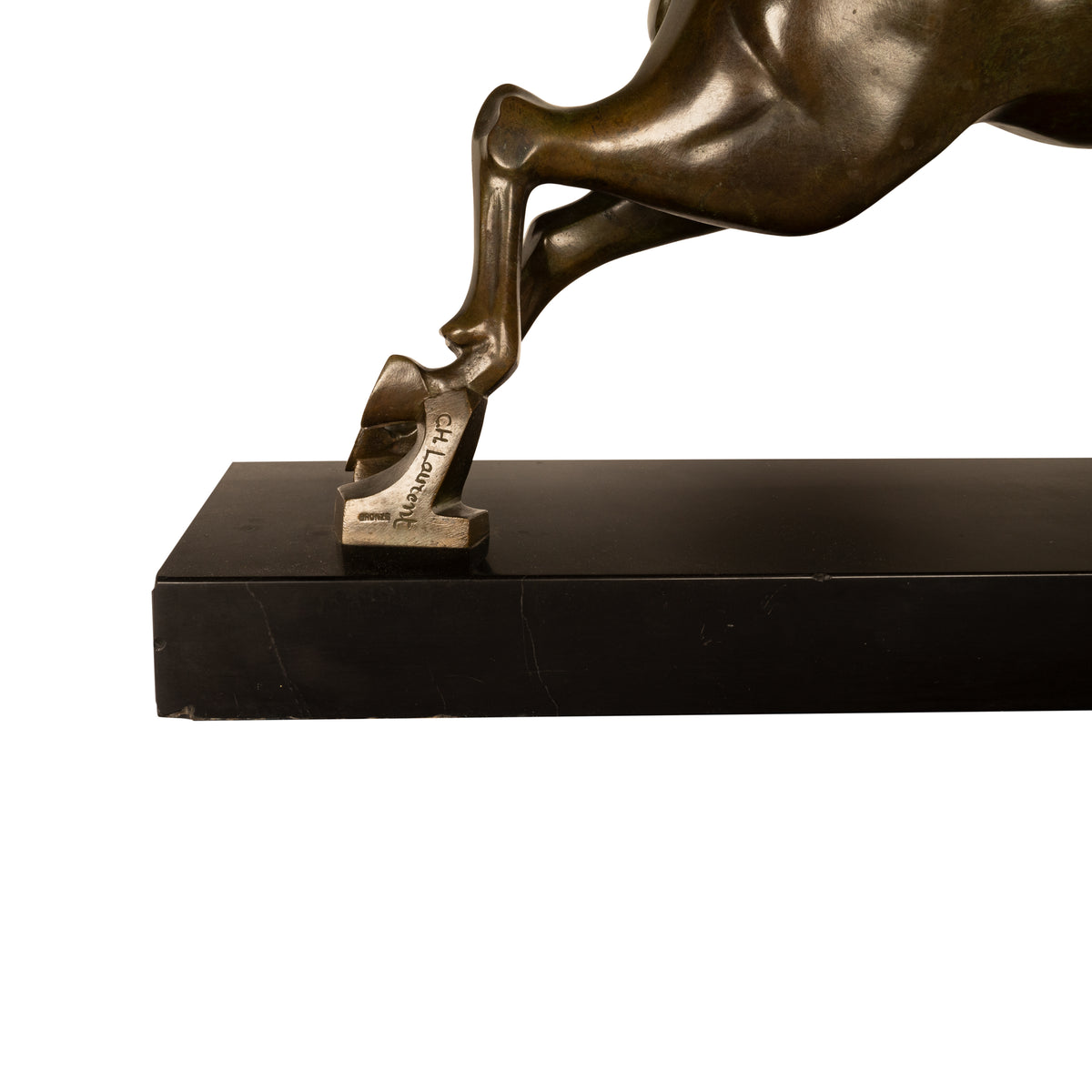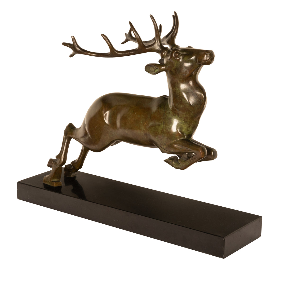 Georges H. Laurent was known for his animal subjects and this bronze is a striking example of his finest work, the bronze depicts a stag in mid leap and mounted on a black marble plinth. The bronze is signed by the artist "G. H. Laurent" on the rear right leg and is also stamped "bronze", the bronze has a wonderful mellow patina, this is the largest of three such sculptures that the artist produced.