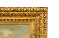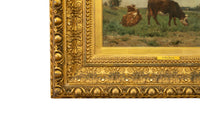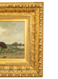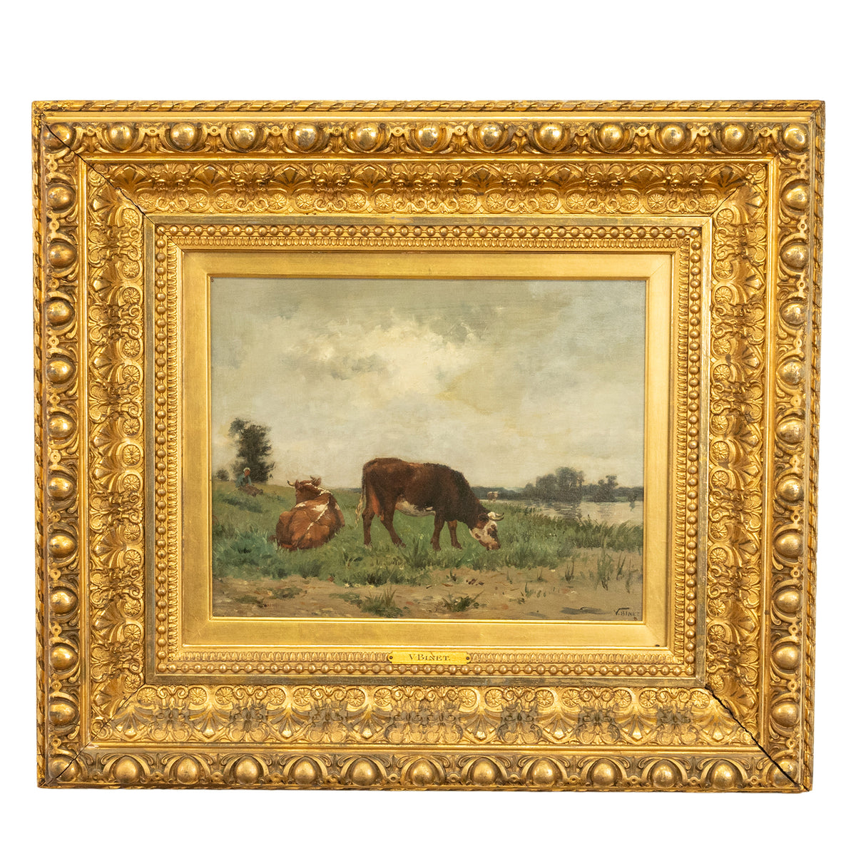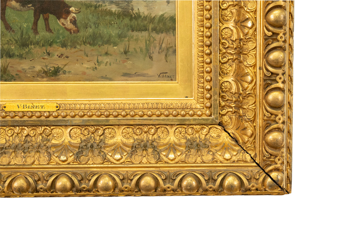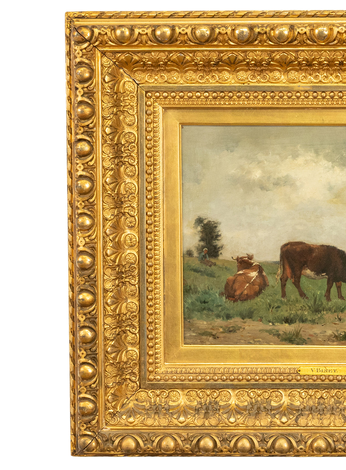 This very attractive & early painting by Binet circa 1875, quintessentially defines the late Barbizon School period. Depicting a pair of cows in a bucolic landscape, one grazing and one resting, within a wooded area and a lake to the background. The painting is signed lower right "V. Binet" and is housed in the original lavishly gilded gesso frame, the painting and frame are in excellent condition, no damage or restoration.