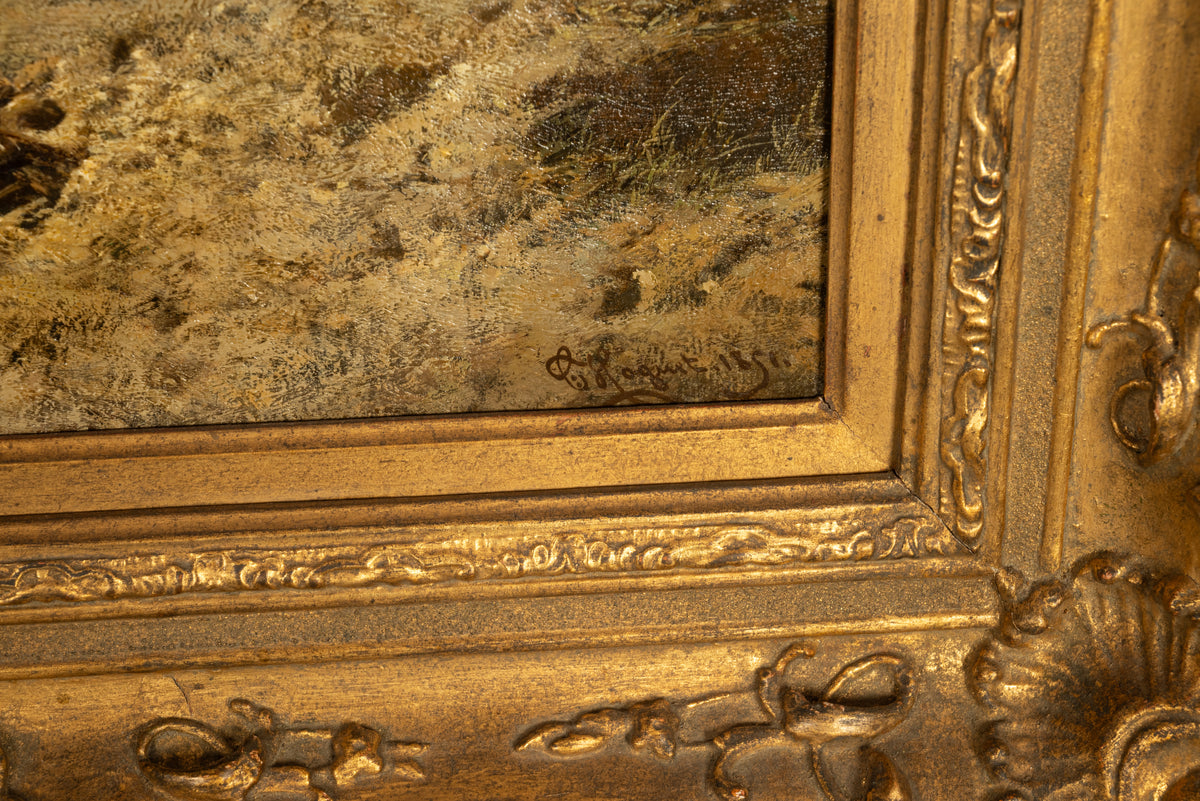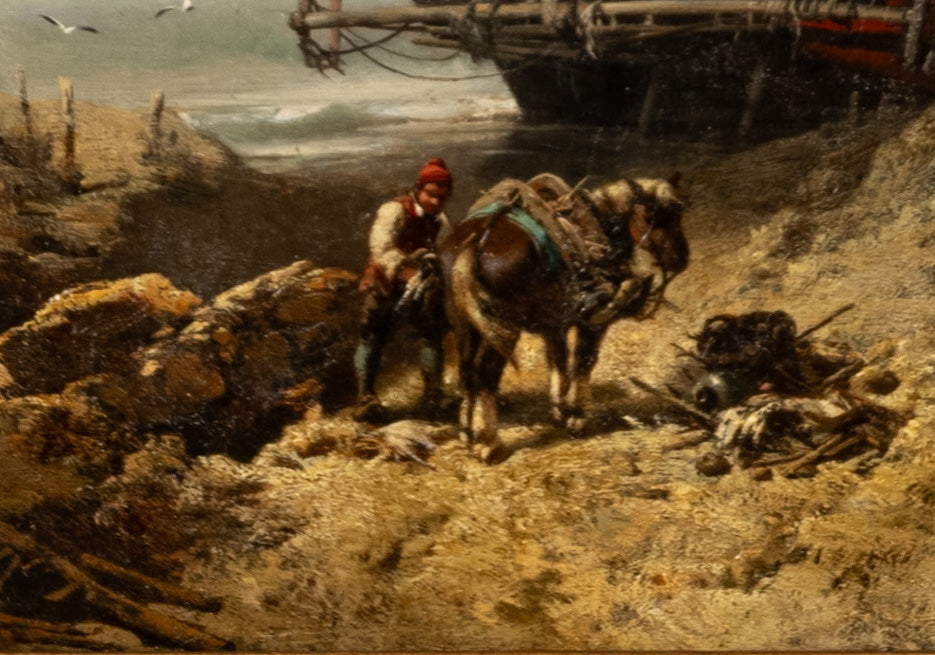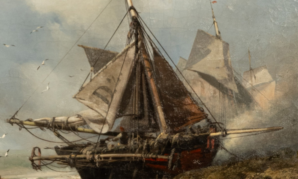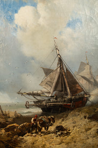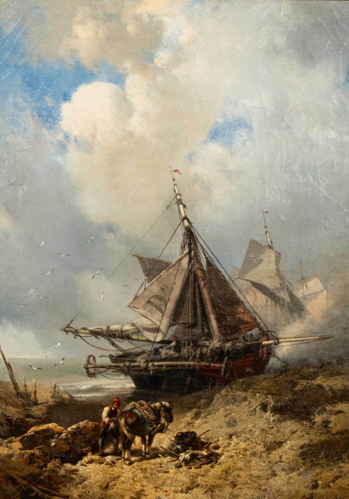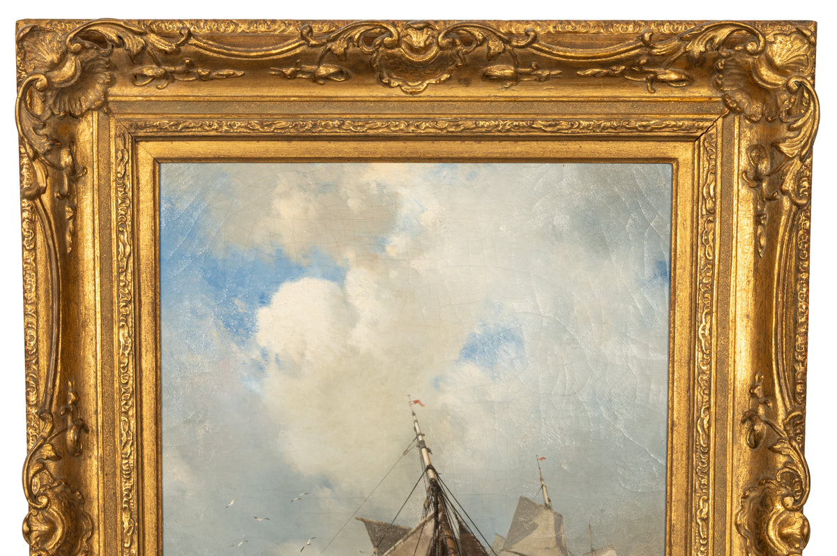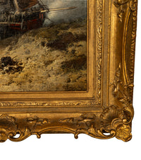 The painting depicts three masted fishing boats with surf crashing on the shore and set against a blue sky yet cloudy sky, with seagulls flying overhead. The scene is set at the foot of the cliffs in Dieppe, France and to the foreground is a man loading baskets of fish onto a workhorse. The painting is signed & dated lower right "C. Hoguet 1851", condition is very good, one small professionally conserved patch to the verso, the painting has just been professionally cleaned. Housed in the original gilded gesso frame, this very attractive painting is ready to hang on your wall.