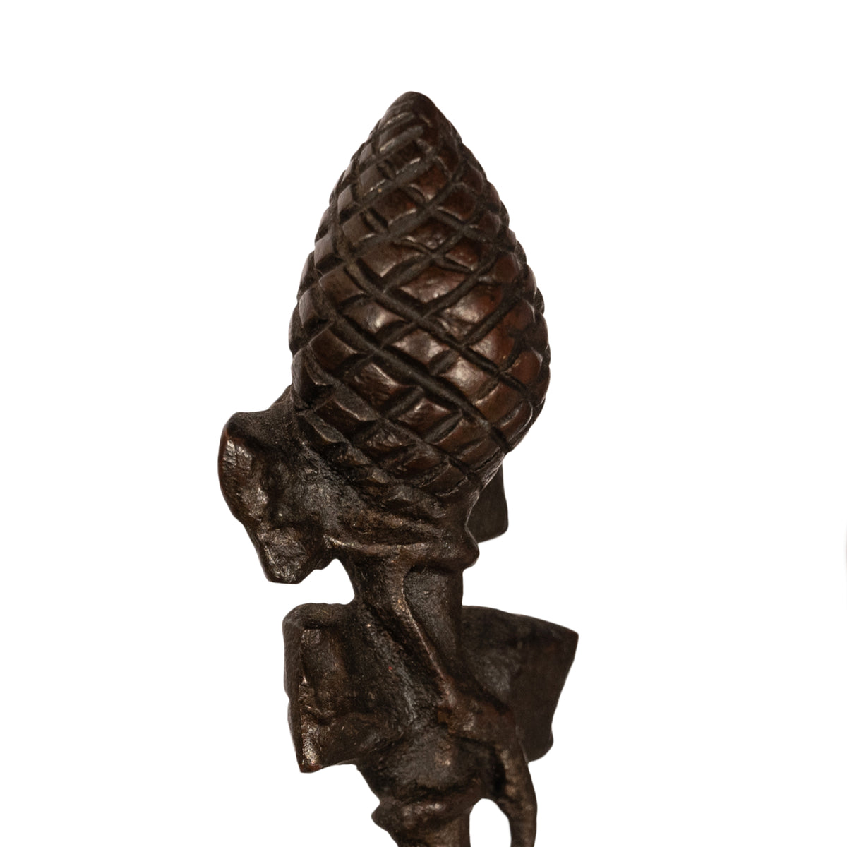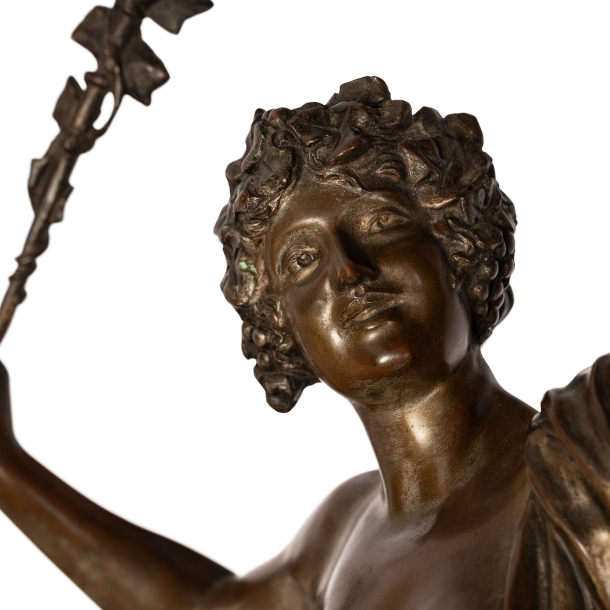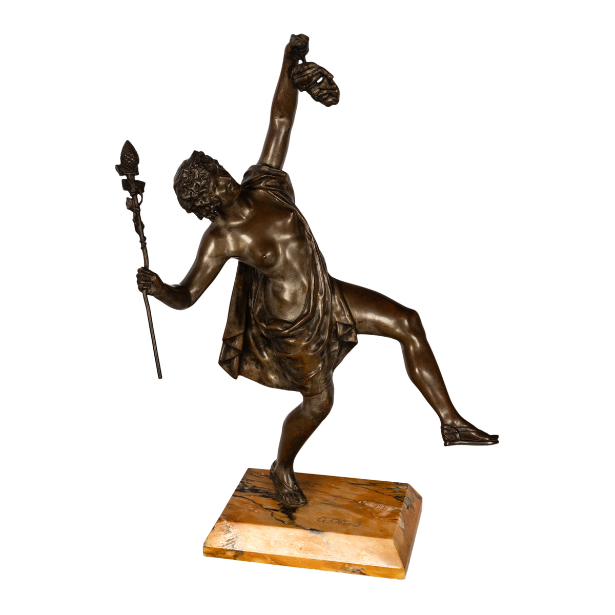 This large & very attractive, finely modeled bronze depicts a female follower of Dionysus the Greek god of wine, fruit, religious ecstacy, fertility, he was also known as Bacchus, a name later adopted by the Romans. These female figures were also referred to as Maenads, which translates as "raving ones". These women were often portrayed in states of ecstatic frenzy characterized through dancing & feuled by wine, often they would handle or wear snakes. This statue depicts a Maenad in frenzied dance, holding a mask in one hand and a thyrsus (a stick wrapped in vine leaves and tipped with a pine cone).