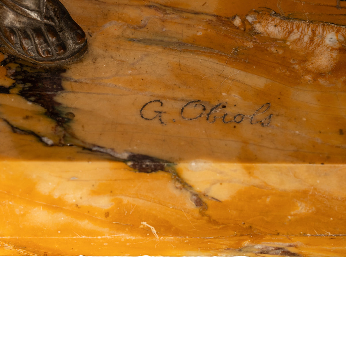 The bronze is raised on a varrigated orange marble plinth with brown and cream striations, the bronze is signed "G. Obiols". Condition is excellent, wonderful patina to the bronze and no damage or restoration, ready to display in your home or possbily wine cellar?