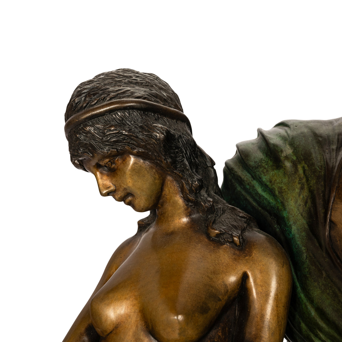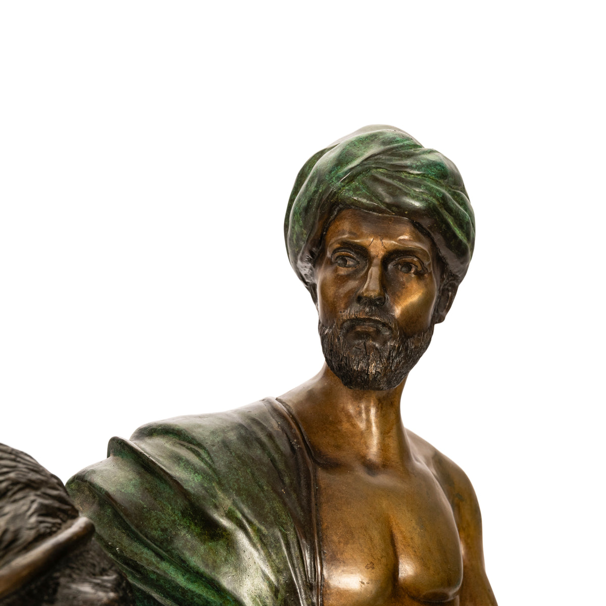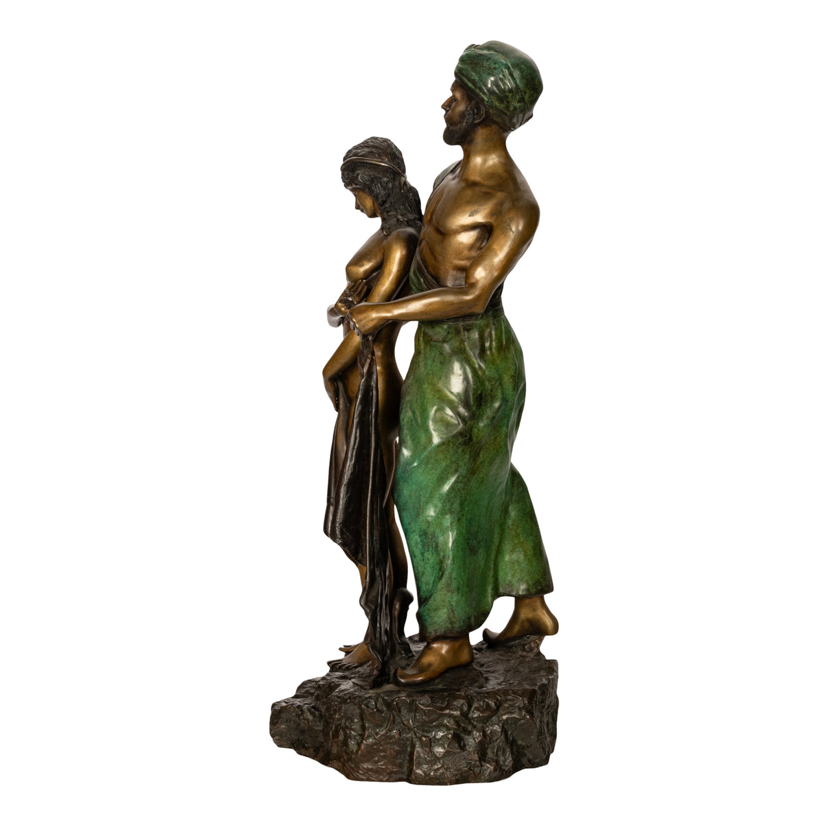 The bronze in the Orientalist manner & depicts a young slave girl and an Arab trader, the two figures standing on a rocky outcrop. He wearing a cold painted robe and she protecting her modesty with a garment. The statue is signed with Bergmann's initial "B" inside a twin handled urn, below are the letters "GESCH" an abbreviation for Geschutzt (meaning protected or copyright) in German/Austrian.