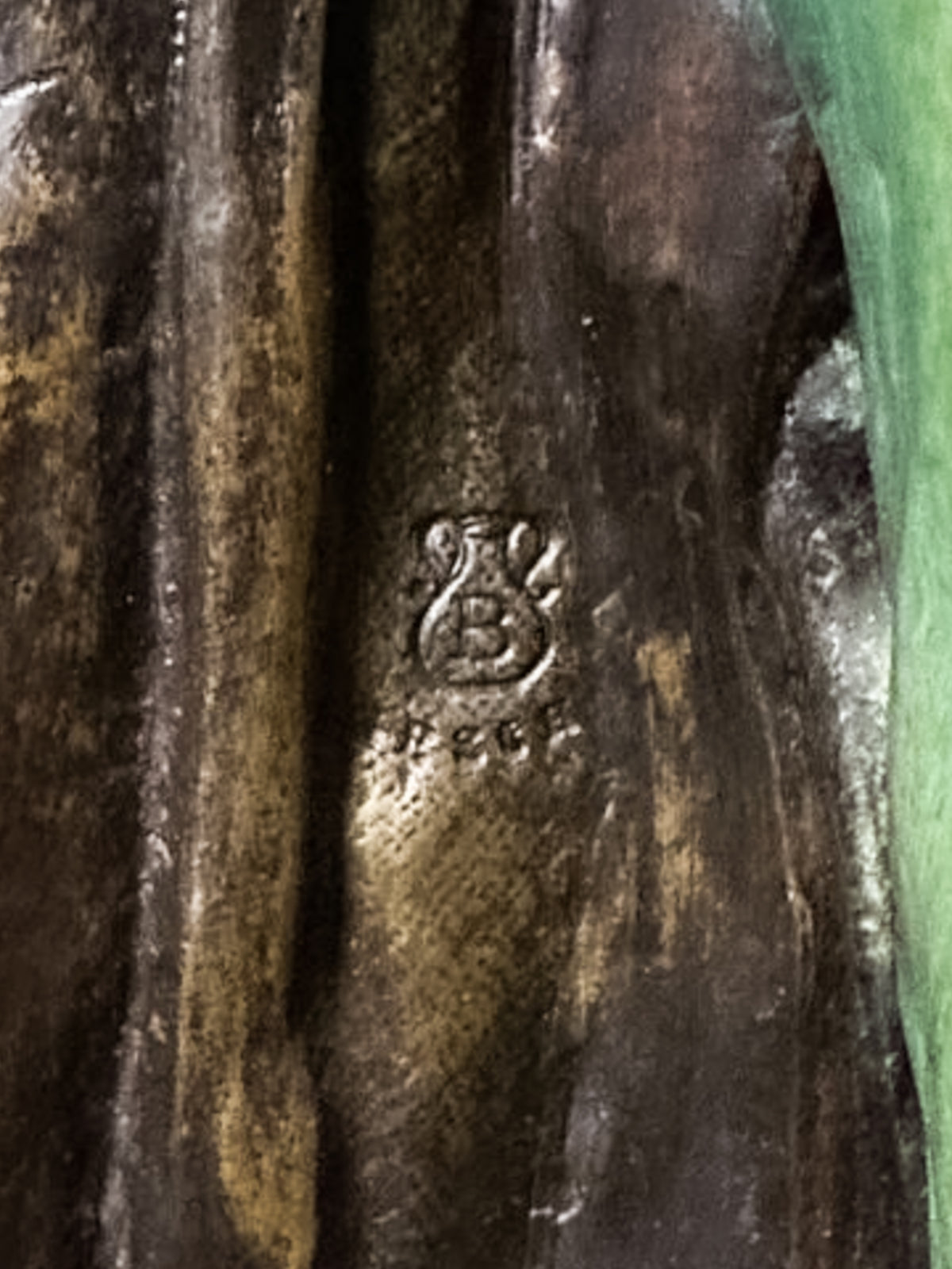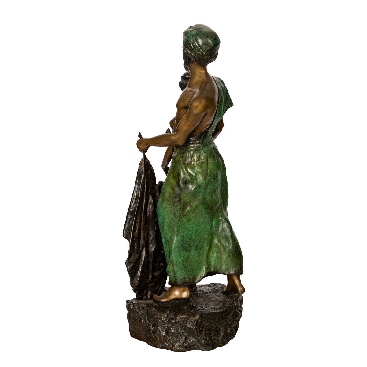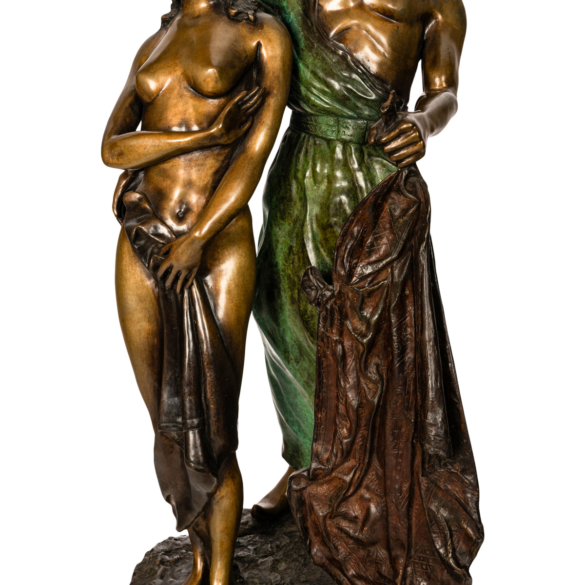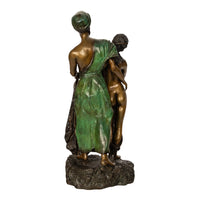 The bronze in the Orientalist manner & depicts a young slave girl and an Arab trader, the two figures standing on a rocky outcrop. He wearing a cold painted robe and she protecting her modesty with a garment. The statue is signed with Bergmann's initial "B" inside a twin handled urn, below are the letters "GESCH" an abbreviation for Geschutzt (meaning protected or copyright) in German/Austrian.