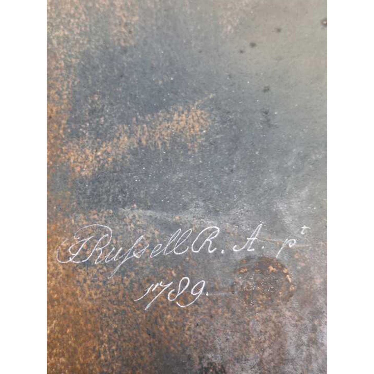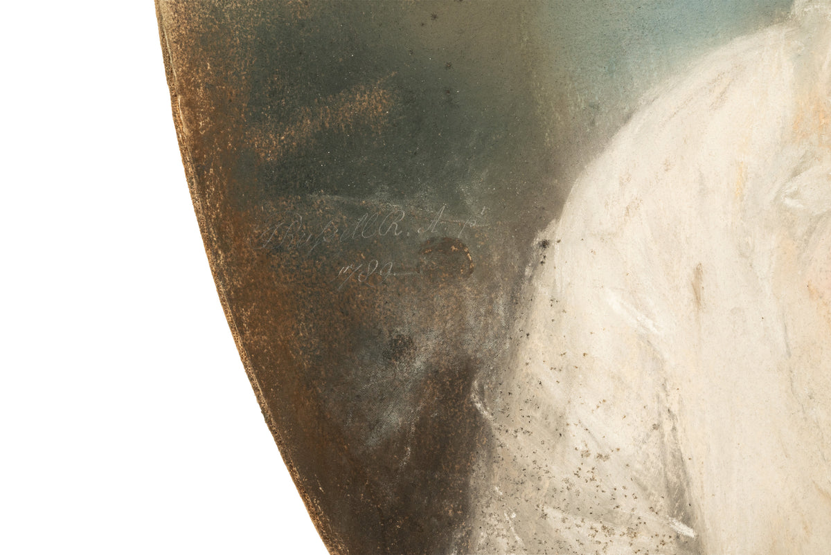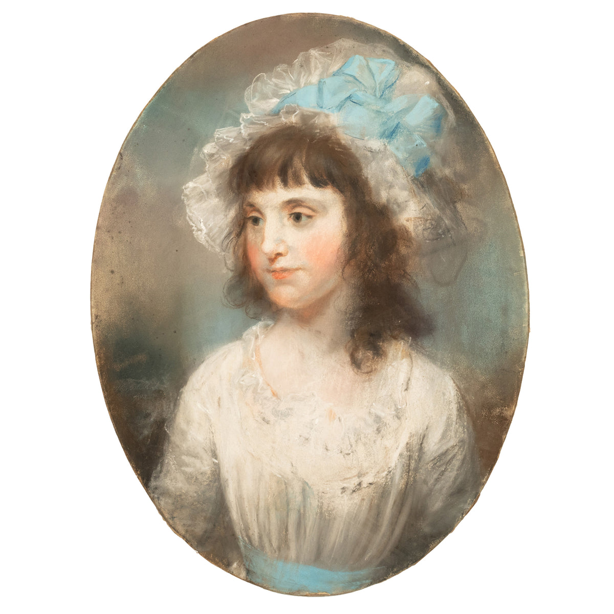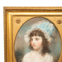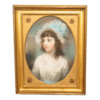 The portrait depicts a young girl wearing a white dress and a muslin bonnet with blue ribbons the painting is signed and dated lower right "J. Russell R A 1789". As yet the sitter is unknown. The portrait is housed in the original gilded frame. An important painting by a celebrated 18th century artist.