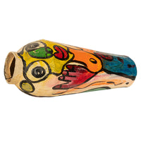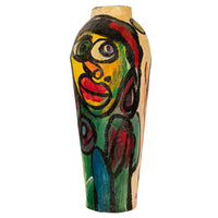 The floor vase is of large size and created from Papier Mache, it features a brightly colored hand-painted figure on each side. The artwork is in excellent condition and ready to take pride of place in your home or office.