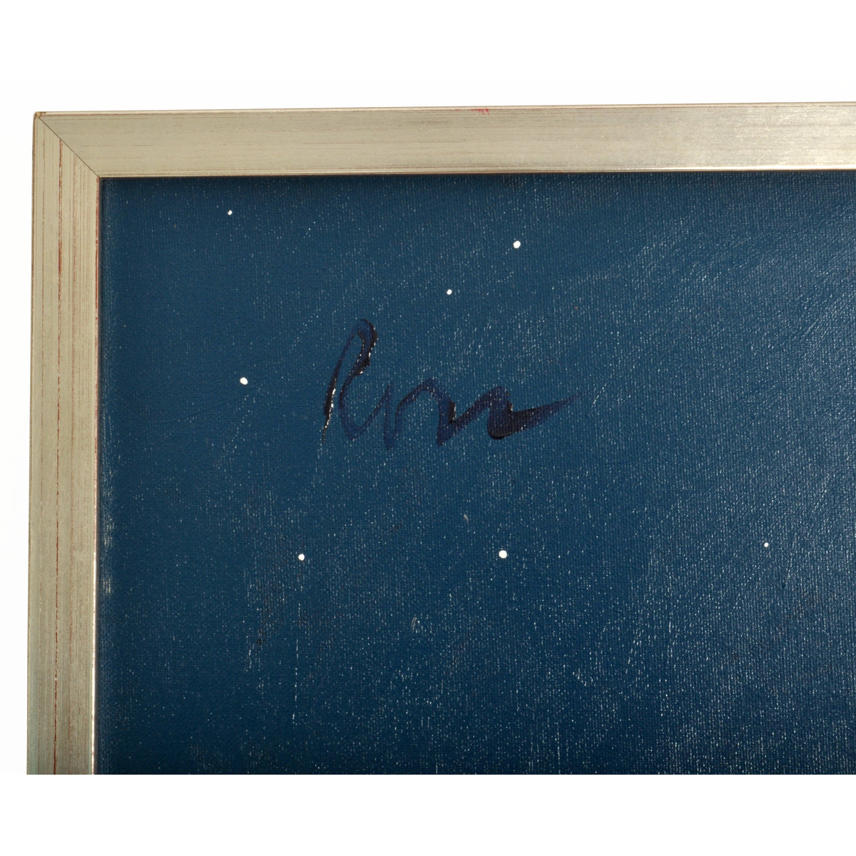 The painting depicts two cowboys at watch under a starry clear night sky, one cowboy sitting between a fence the other crouched with his rifle pointing skyward, a Pueblo adobe house to the background. The painting signed to the top left corner.