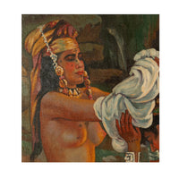 The painting depicts two young North African Berber (Amazigh) women, a tender "rights of passage" portrayal of one young naked woman placing a robe over another. Possibly a cermony for puberty or marriage, both young women are wearing traditional Berber silver anklets & wrist bangles and traditional Berber tattooes.