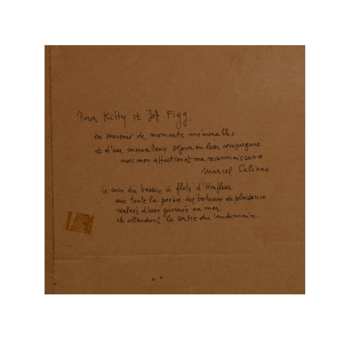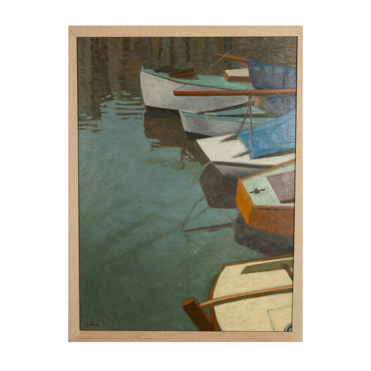The painting depicts a series of small brightly colored sailboats, side by side and reflected in the water of the dock, the painting is signed lower left "Salinas" and is housed in the original frame, condition is excellent. Salinas not only collaborated with and made prints for Pablo Picasso, he also worked with Henri Cartier-Bresson, Ludwig Bemelmans (Illustrator for the Madeline books) and the grandfather of Op Art Victor Vasarley and many more.