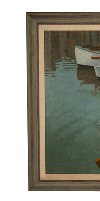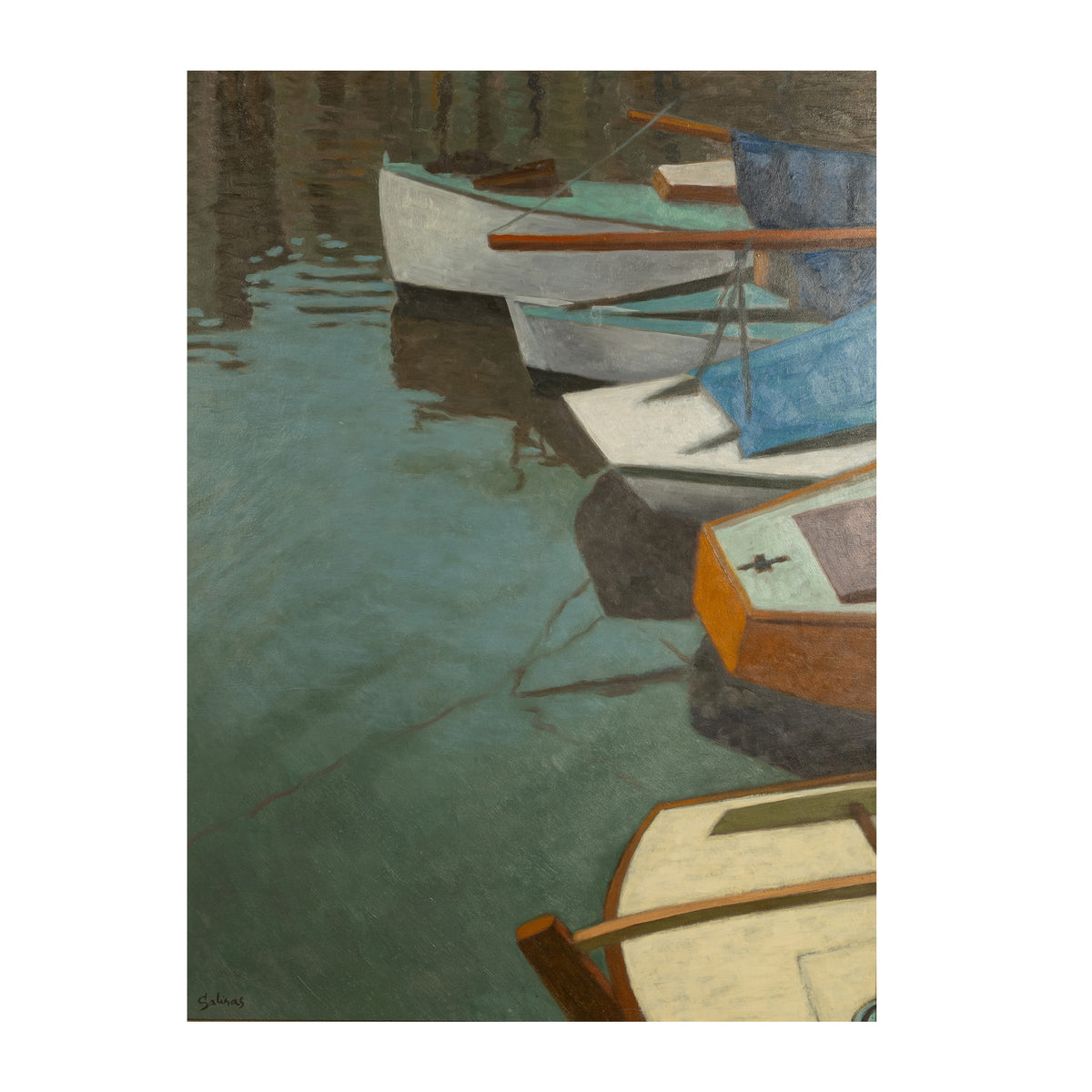 Salinas, like Picasso had a very long life and career and as Picasso he adopted several styles including Cubism and Fauvism. This painting demonstrates a more mature style, incorporating light & color. The painting is titled "Boats at Dock", this is the original oil painting that was later produced as ten Artist's Proof lithographs and a numbered lithographic edition of 125.