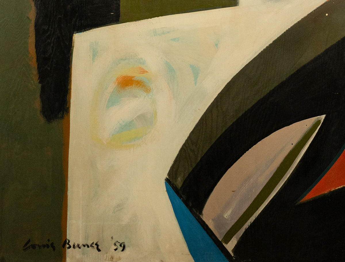 A rare & important and monumental abstract painting by the celebrated Oregon artist Louis Bunce, the artist was commissioned to paint a mural for the 1959 Oregon Centennial & Trade Fair in Portland, the installation was titled " Gay Garden Way ", it was painted for the exterior of the Horticultural building. The mural having abstract plant abstractions, according to Bunce in his own words it was "the rounded shapes of flowers and the sun", the mural created a major furor from the conservative art public.