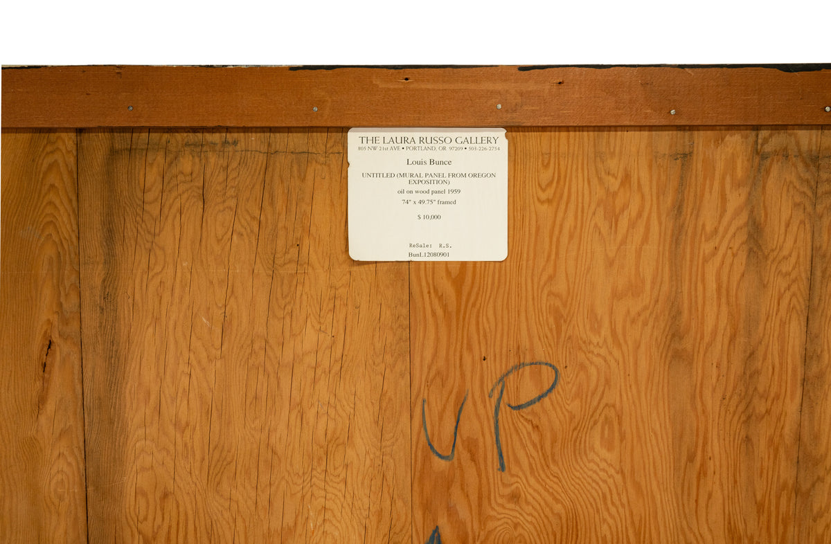 Monumental modernist oil on panel painting by Louis Demott Bunce (1907-1983), from an installation for the Oregon Centennial Exposition, 1959.