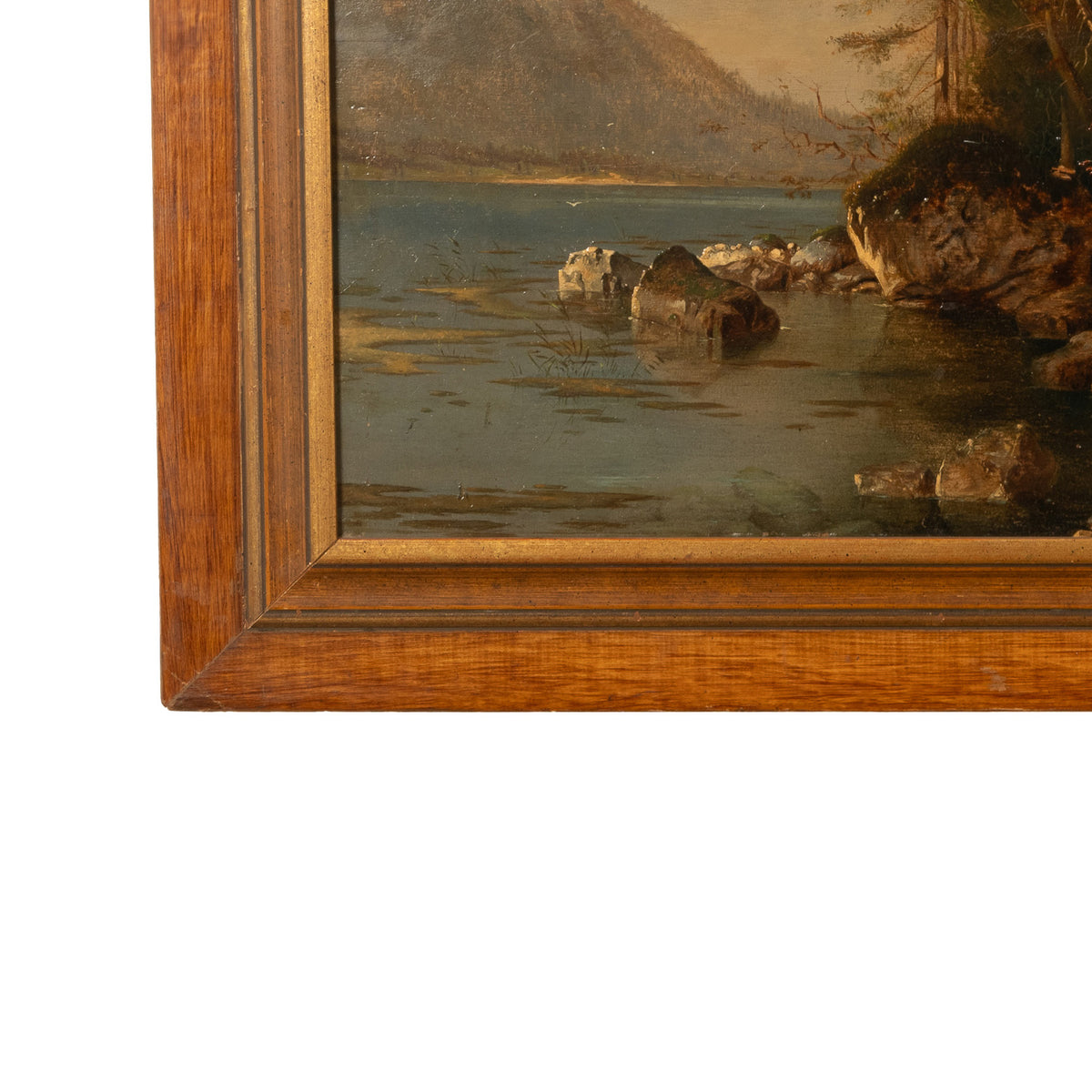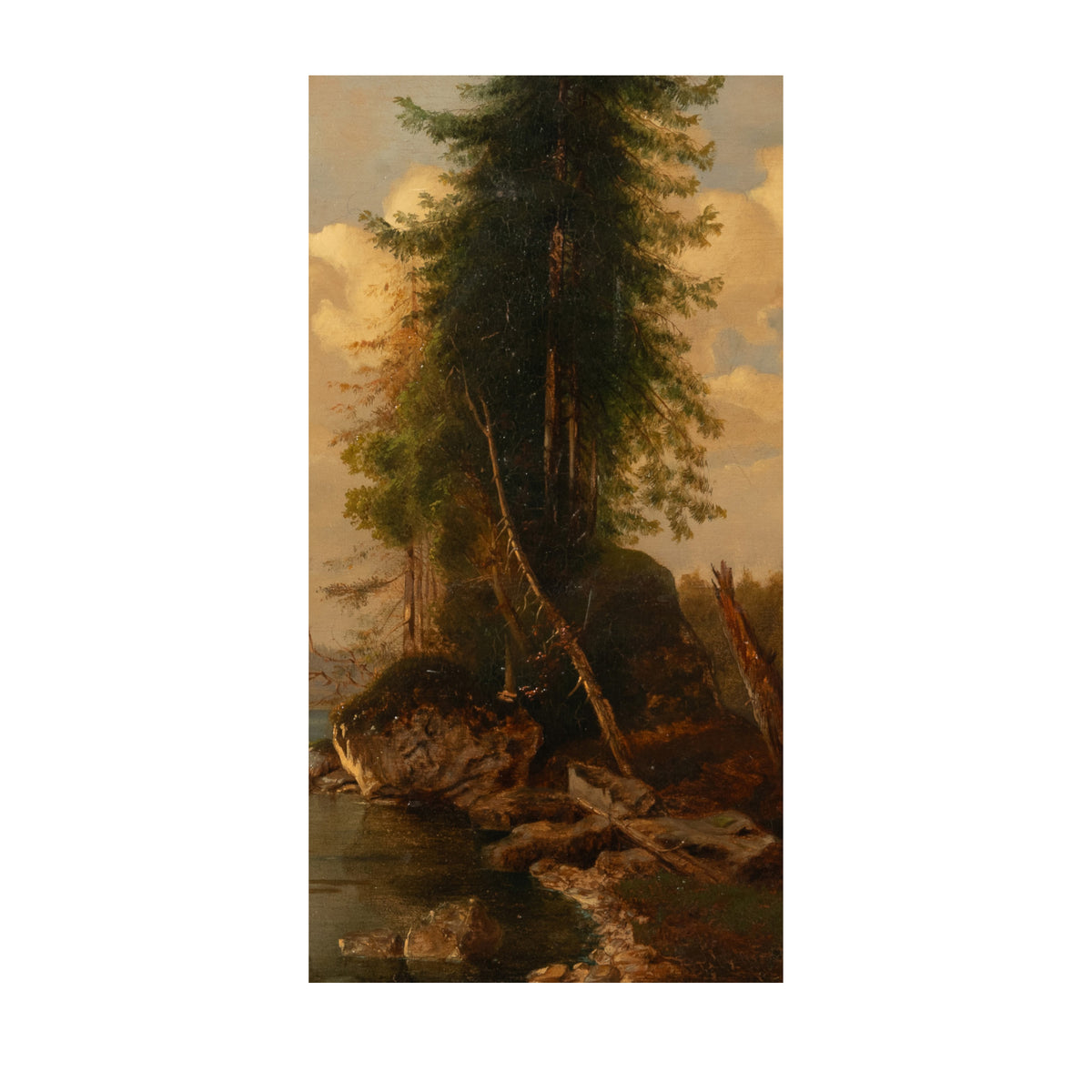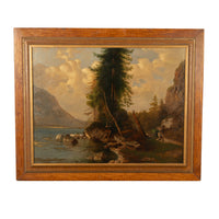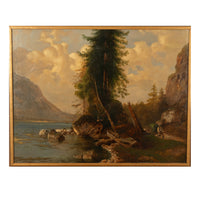 Antique Oil on Canvas Painting Jean-Michel Cels (1819–1894), Circa 1850. A finely painted river scene with trees and mountainous landscape behind. The painting having one figure walking down the river bank, the painting signed lower right and housed in a gilt and hardwood frame.