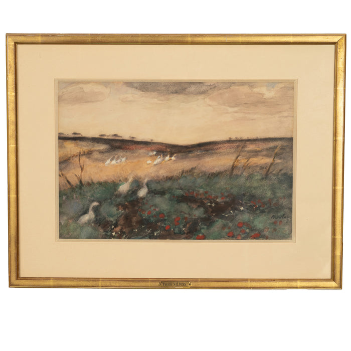 Russian French Impressionist Watercolor Gouache Landscape with Geese Painting by Pyotr Alexandrovich Nilus 1930