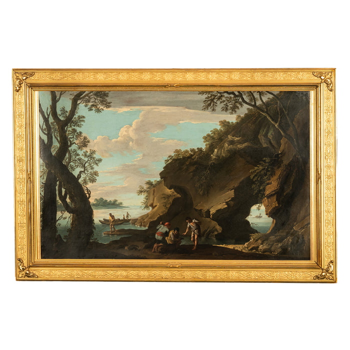 Italian 17th Century Baroque Oil on Canvas Painting Coastal Landscape Fishermen, Salvator Rosa Circa 1650