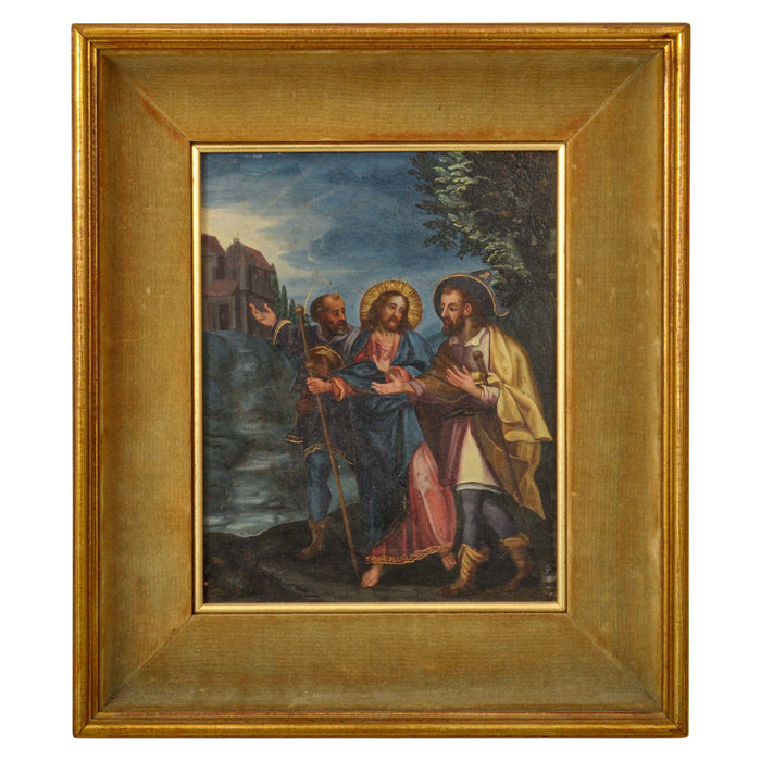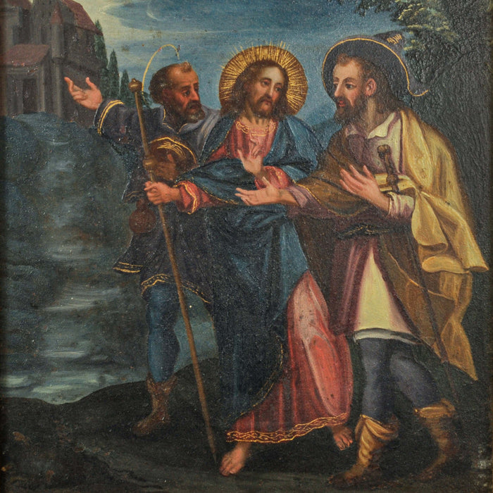 18th Century Italian Old Master Tempera on Panel Painting "Jesus Road to Emmaus" Circa 1700