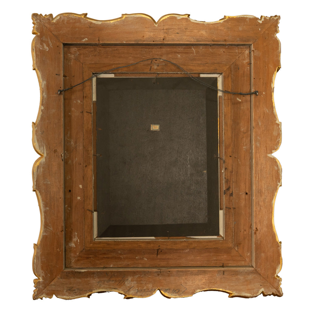 This very finely executed painting rendered in oil paint on canvas, in the original gilt frame, depicts a cavalier in his large brimed hat sitting alone at a table, gazing out at the viewer and holding an empty fluted glass. Behind him on a barrel is a smoking pipe and an extinguished candle in a candle holder. On the table, a blue and white Delft pottery wine jug sits atop a red tablecloth and an impressively delicately rendered doily. An empty plate and silverware along with an enamled & gilded glass vessel give the impression that the figure is perhaps at a dining establishment such as a tavern, having completed a hearty meal and a few glasses of wine and looks to be in a a merry mood! The painting is signed and dated lower left "A. Schröder 1899". painting is housed in the original giltwood & gesso frame. Condition is excellent and this handsome painting is ready to hang on your wall.
