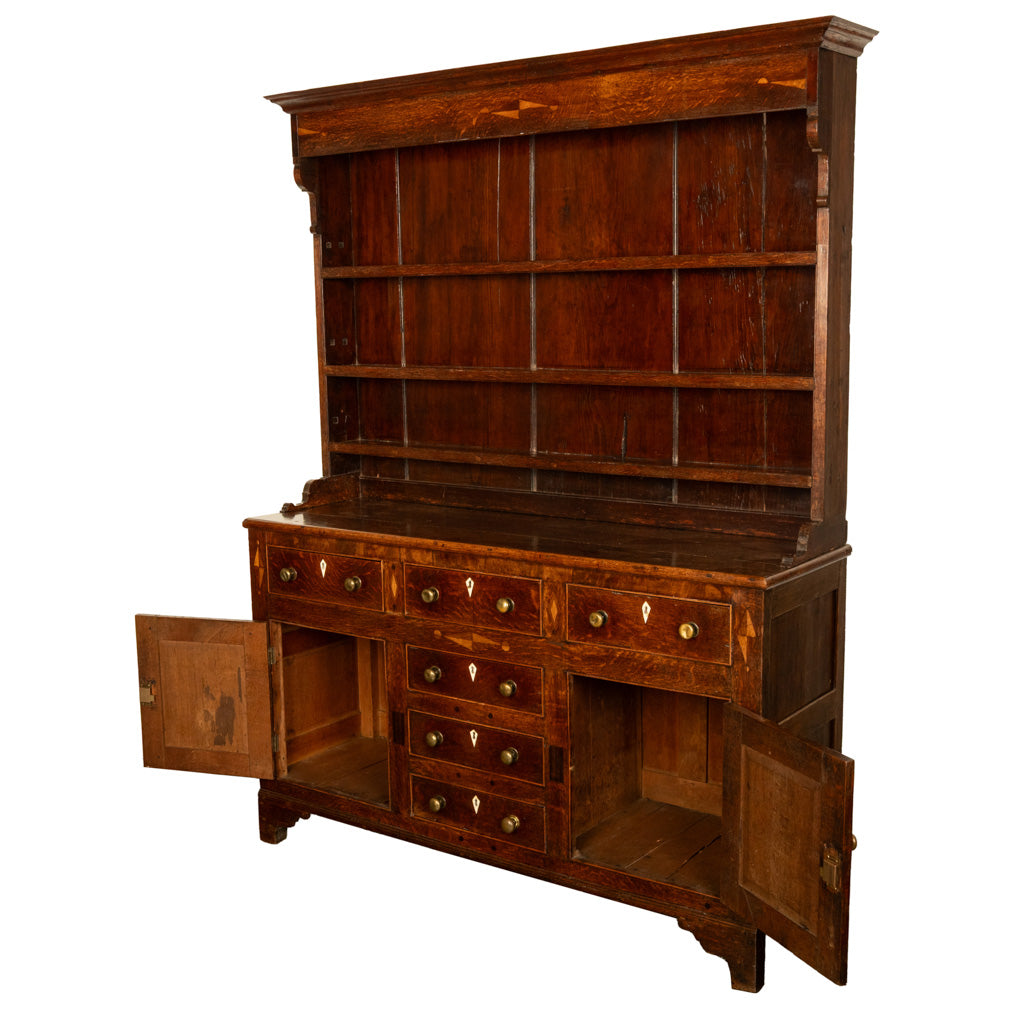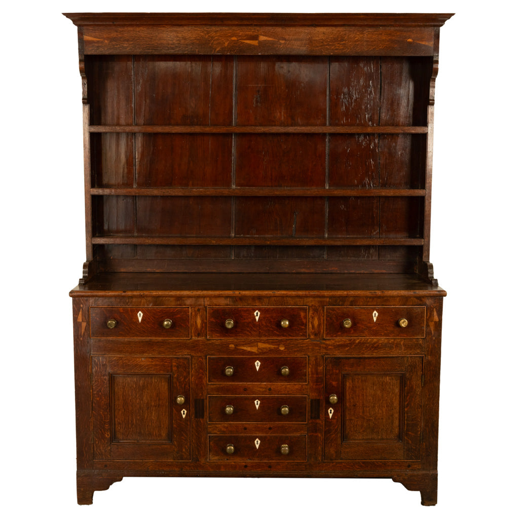 A very handsome oak dresser of attractive proportions from the Conwy area of North Wales, it is in two section the dresser base & plate rack top. The enclosed plate rack with an ogee shaped cornice with an inlaid pediment below, the geometric fruitwood inlay of circular & lozenge shape, the plate rack with three shelves. The base with three frieze drawers over three central drawers and are flanked by two paneled cupboard doors enclosing spacious storage areas, all the drawers and doors are fitted with the original round brass pulls. The dresser base has corresponding circular & lozenge shaped fruitwood inlays & the drawers and doors have 'kite' shaped ivory inlaid escutcheons/lock-plates , the dresser in raised on shaped bracket feet.