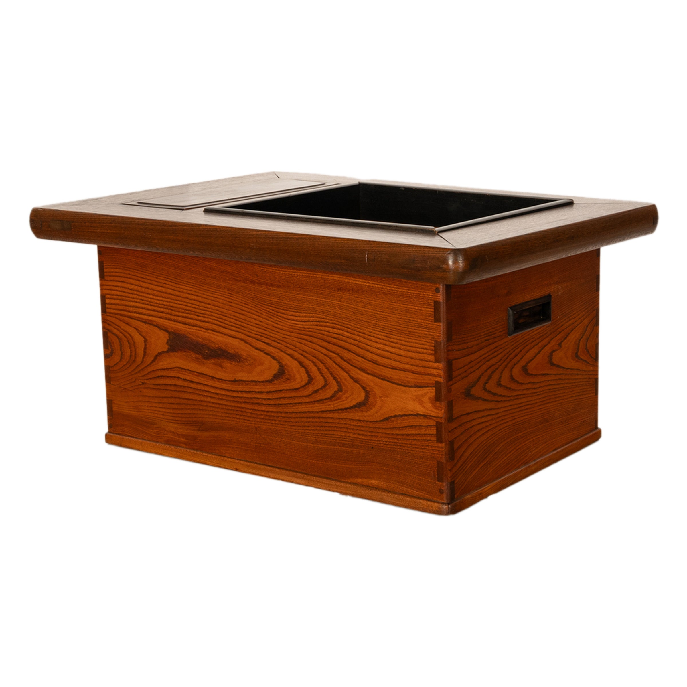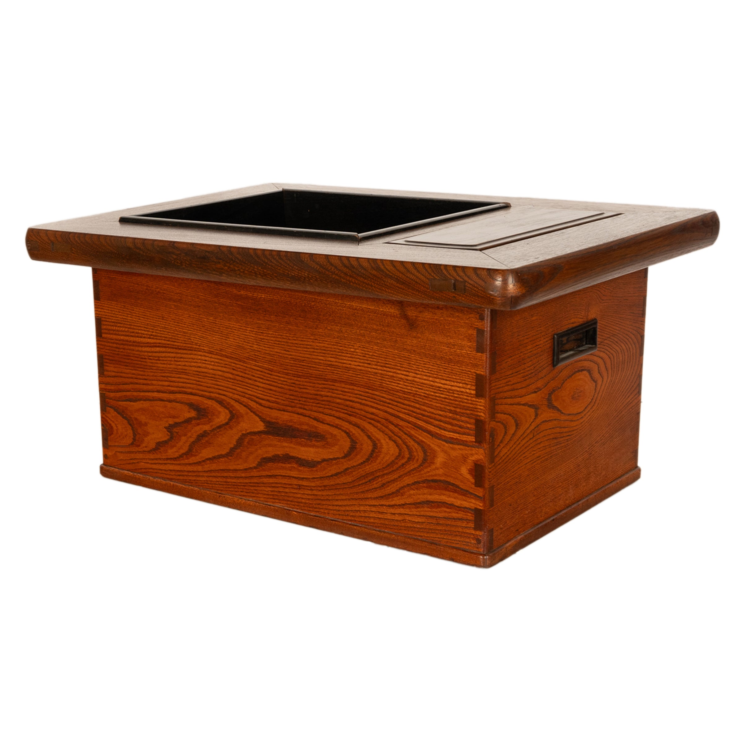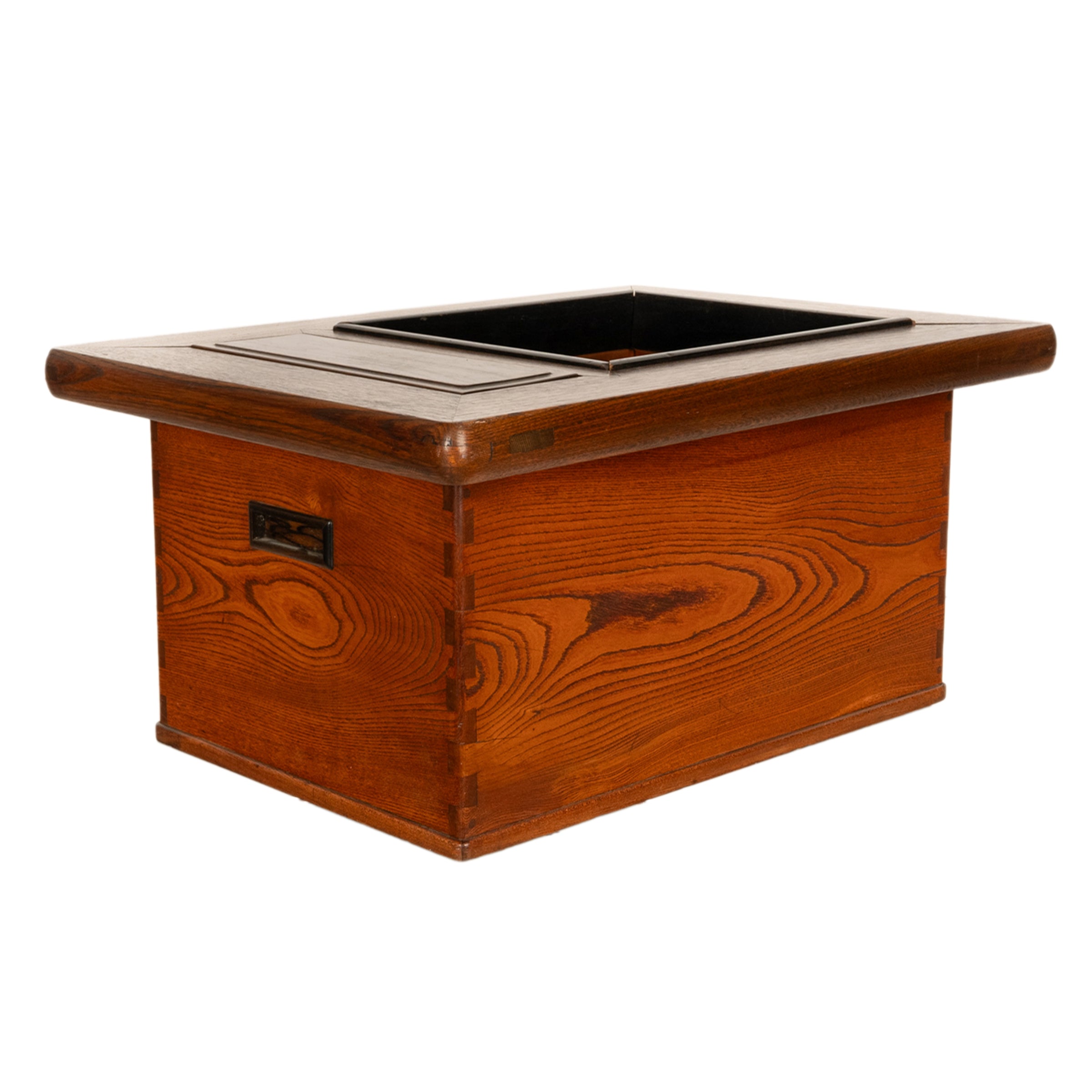 The hibachi is made from finely grained Keyaki wood and has the original copper liner, it is very well made by a master cabinet maker, dovetailed throughout. The hibachi has twin inset iron handles to the sides, the top having a lidded storage area with a pull out drawer, the hibachi is fitted with the original copper liner.