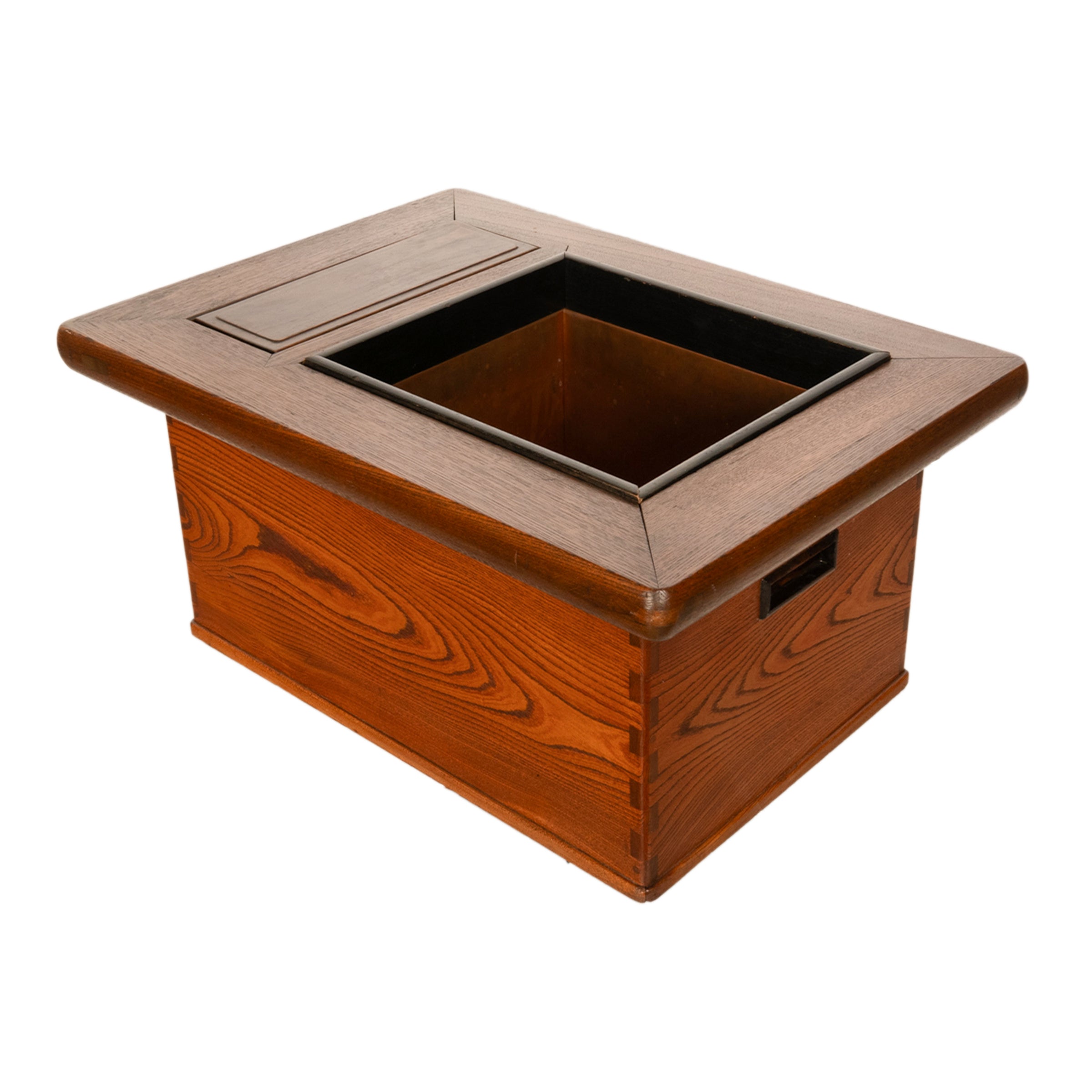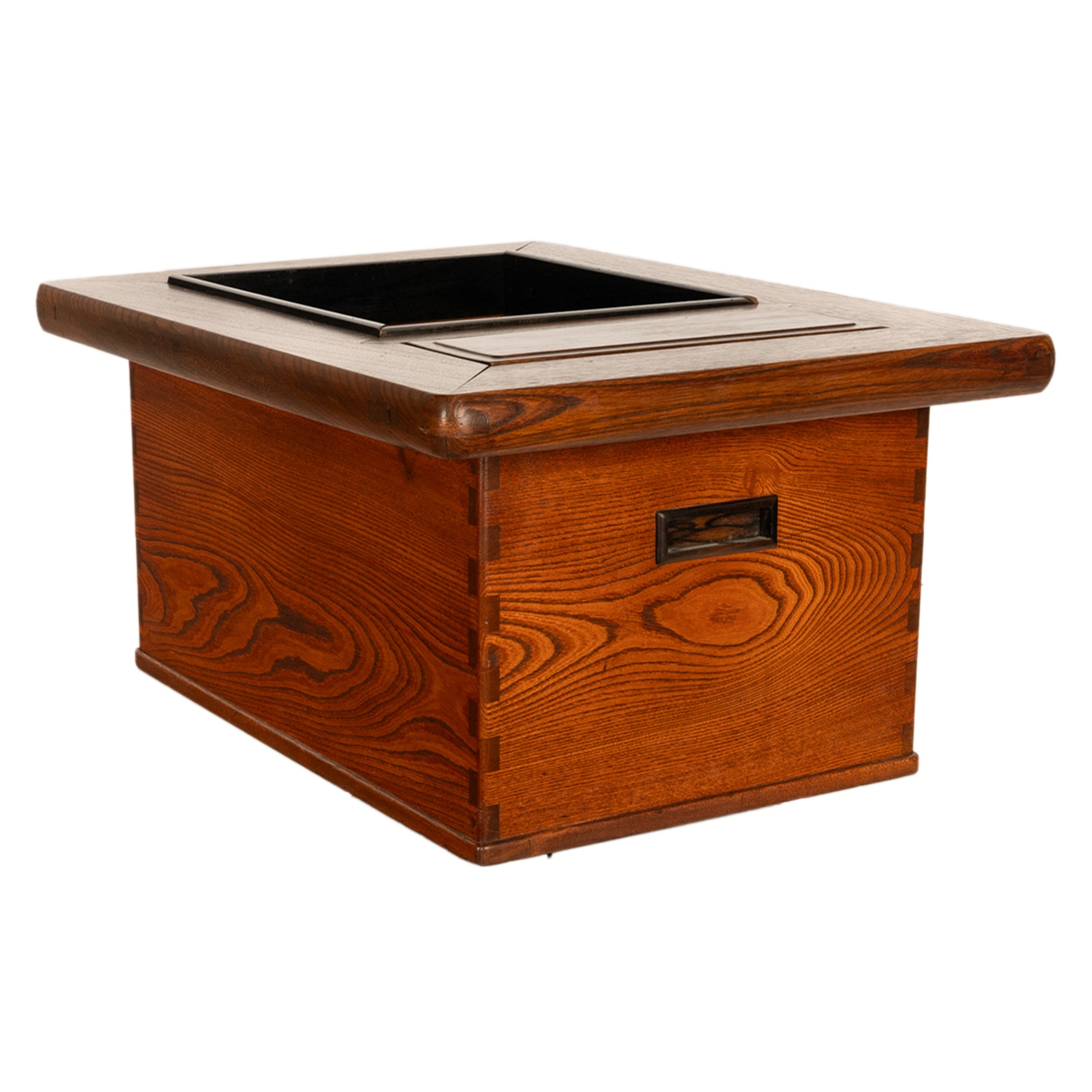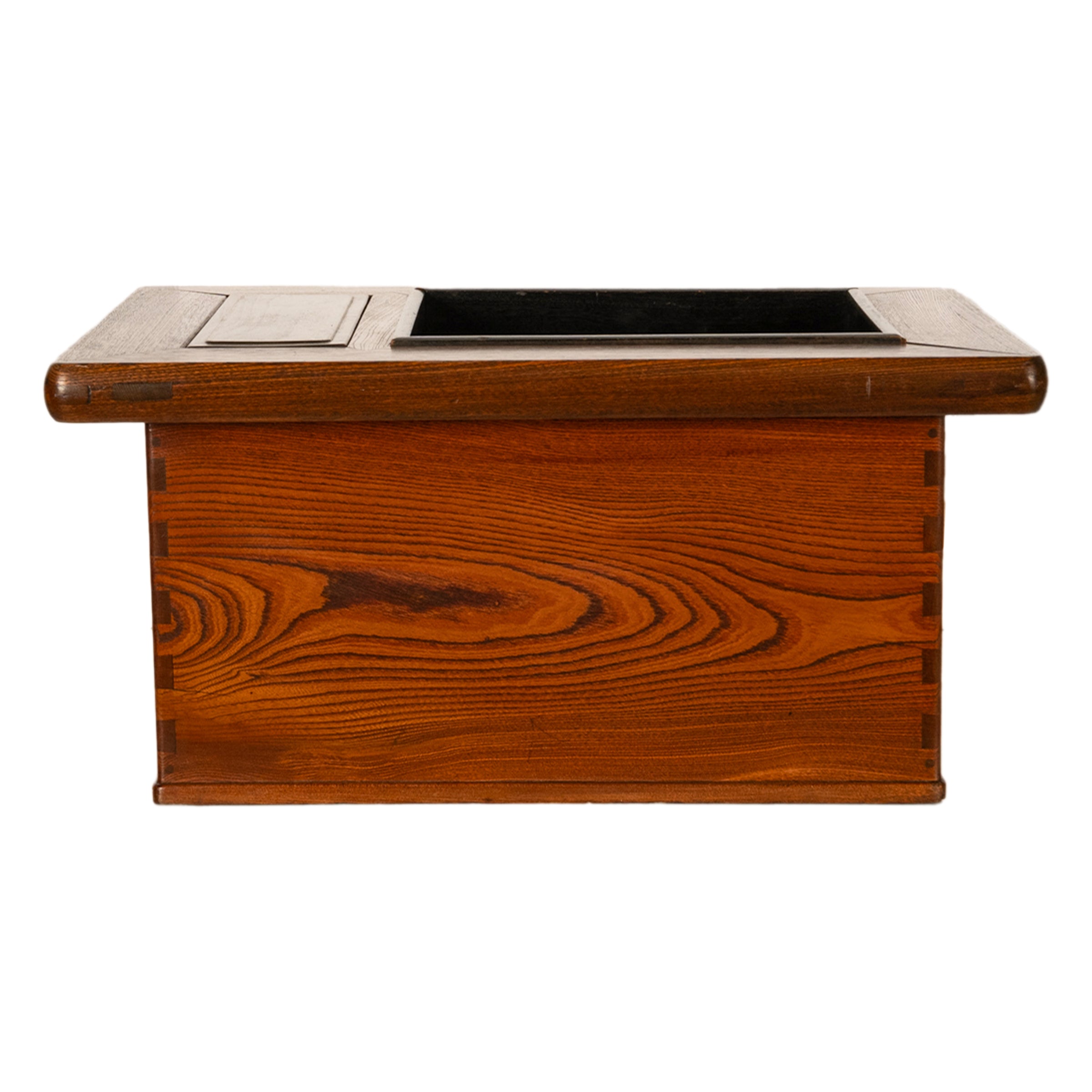 The hibachi is made from finely grained Keyaki wood and has the original copper liner, it is very well made by a master cabinet maker, dovetailed throughout. The hibachi has twin inset iron handles to the sides, the top having a lidded storage area with a pull out drawer, the hibachi is fitted with the original copper liner.