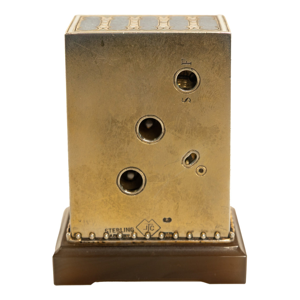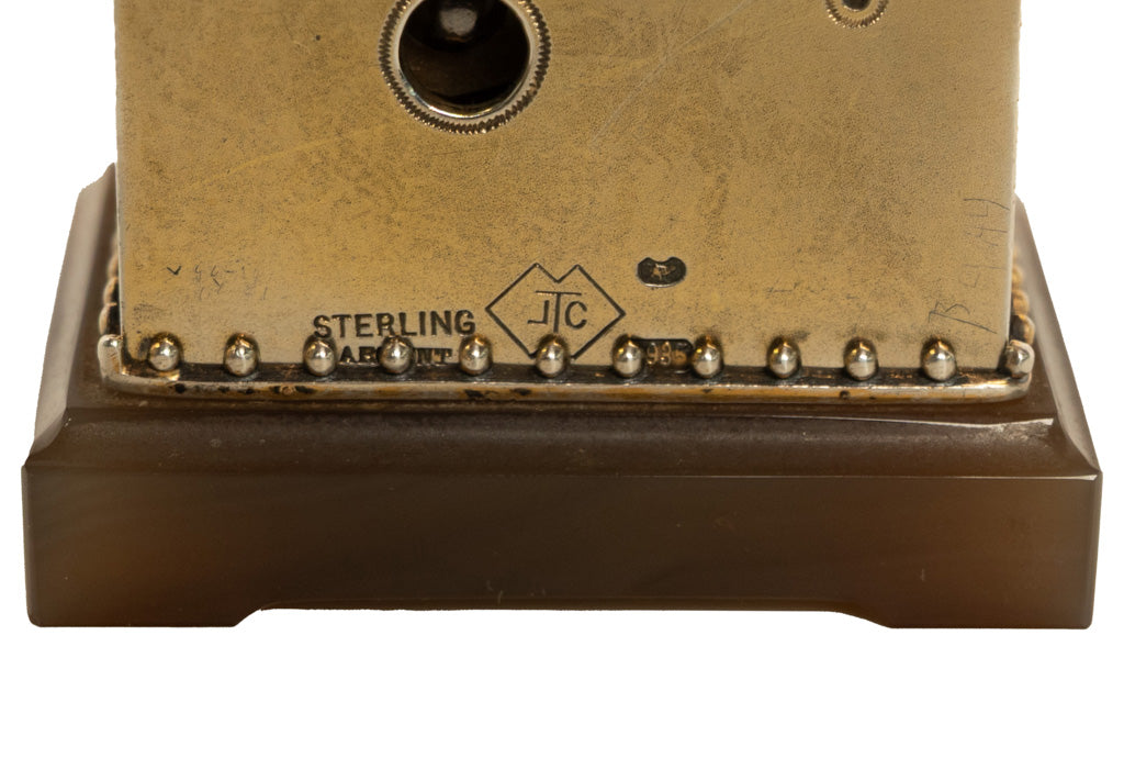 The clock is stamped to the rear "Sterling" & "Argent" & 0.935, Geneva assay mark '935'. The clock was most likely designed by Maurice Coüet who designed clocks for both Cartier & The Geneva Clock Co. The clock is stamped with the "JTC" mark in a cartouche.
