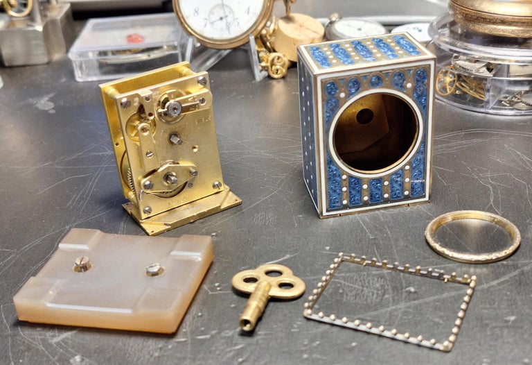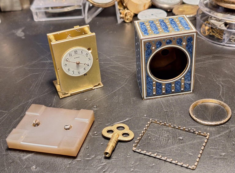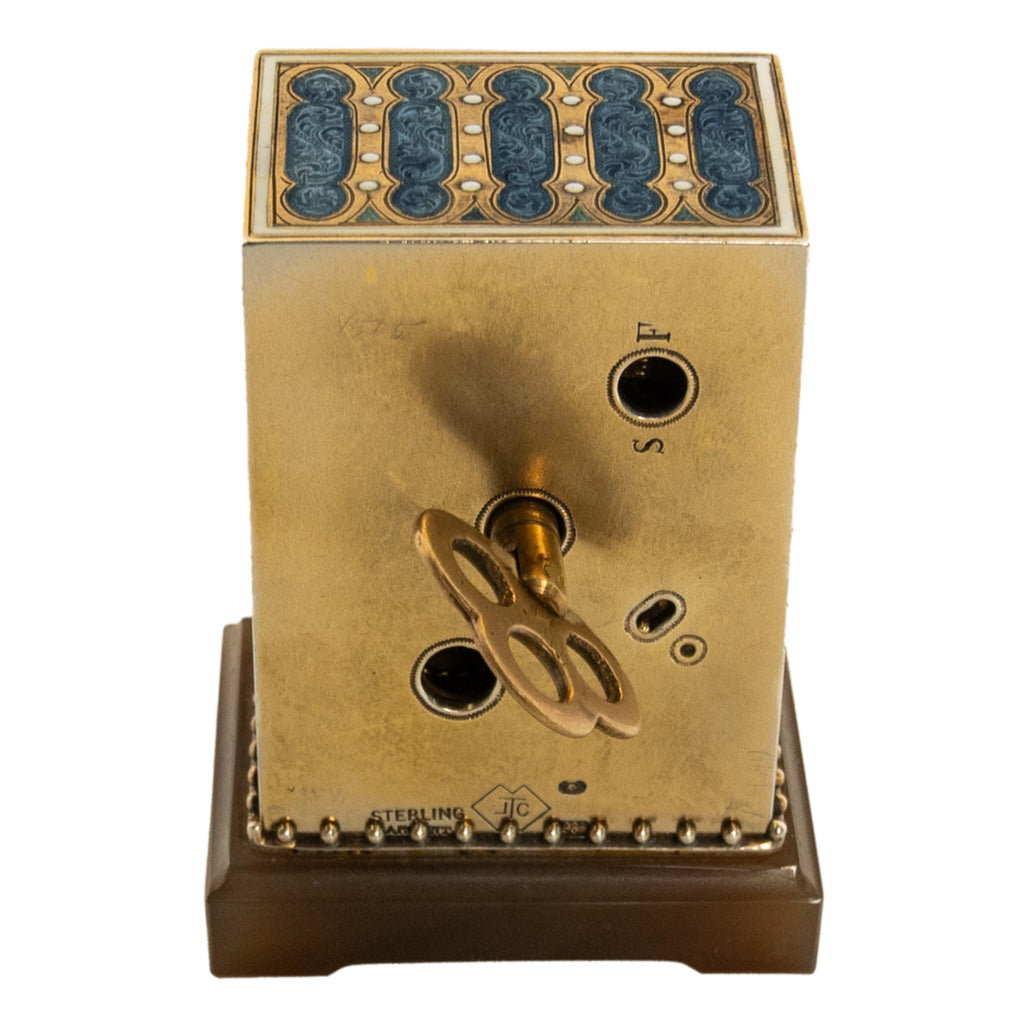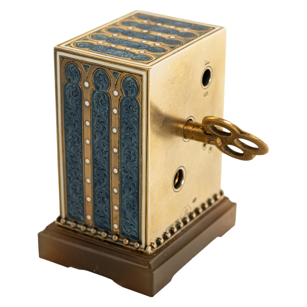 The clock having a silver gilt case with guilloched enamel decoration, the rare & unusual decoration inspired by the architecture of the Alhambra and Moorish Spain, in the form of long mihrab shaped windows punctuated with circular white enameled 'jewels'. The base with a frieze of silver gilt spheres and the clock is raised on a striated agate base.