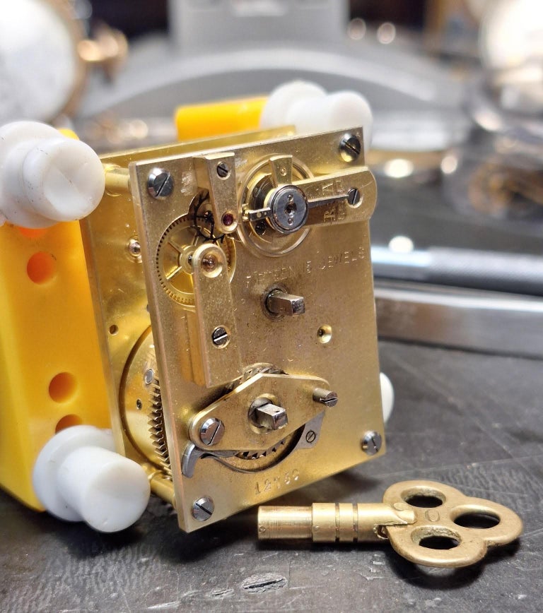The last three images show the clock during the cleaning process on the clocksmith's workbench.