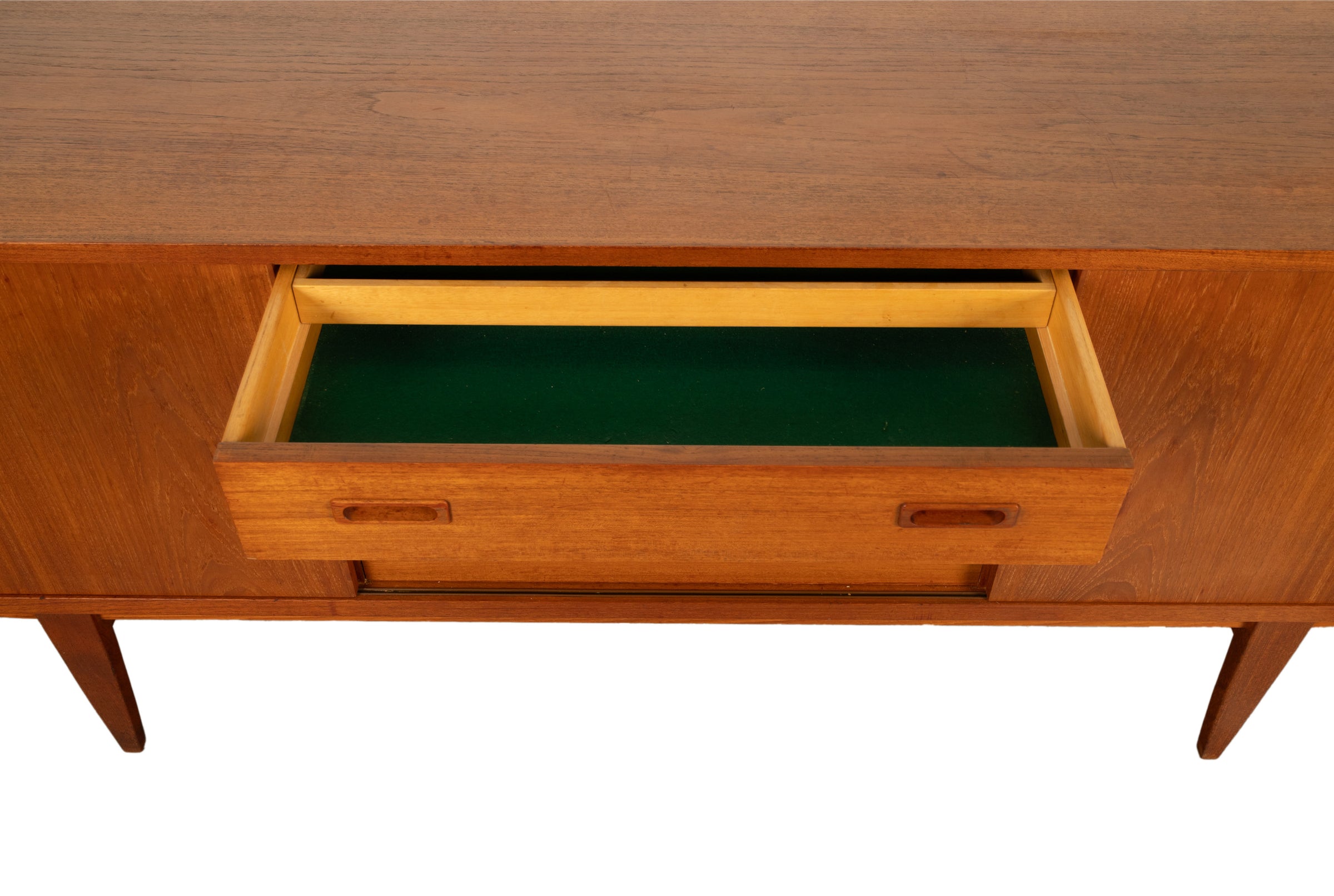 This very stylish credenza is made from finely figured teak, at end each is a sliding door enclosing a single shelf, the right side is fitted with a bar shelf that cuts away to store oversized bottles and storage for glasses above. The doors flank a bank of drawers to the center, the top drawer having an interior sliding drawer, the credenza is raised on four tapered legs joined with a single stretcher. The credenza having the maker's branded stamp to the verso.
