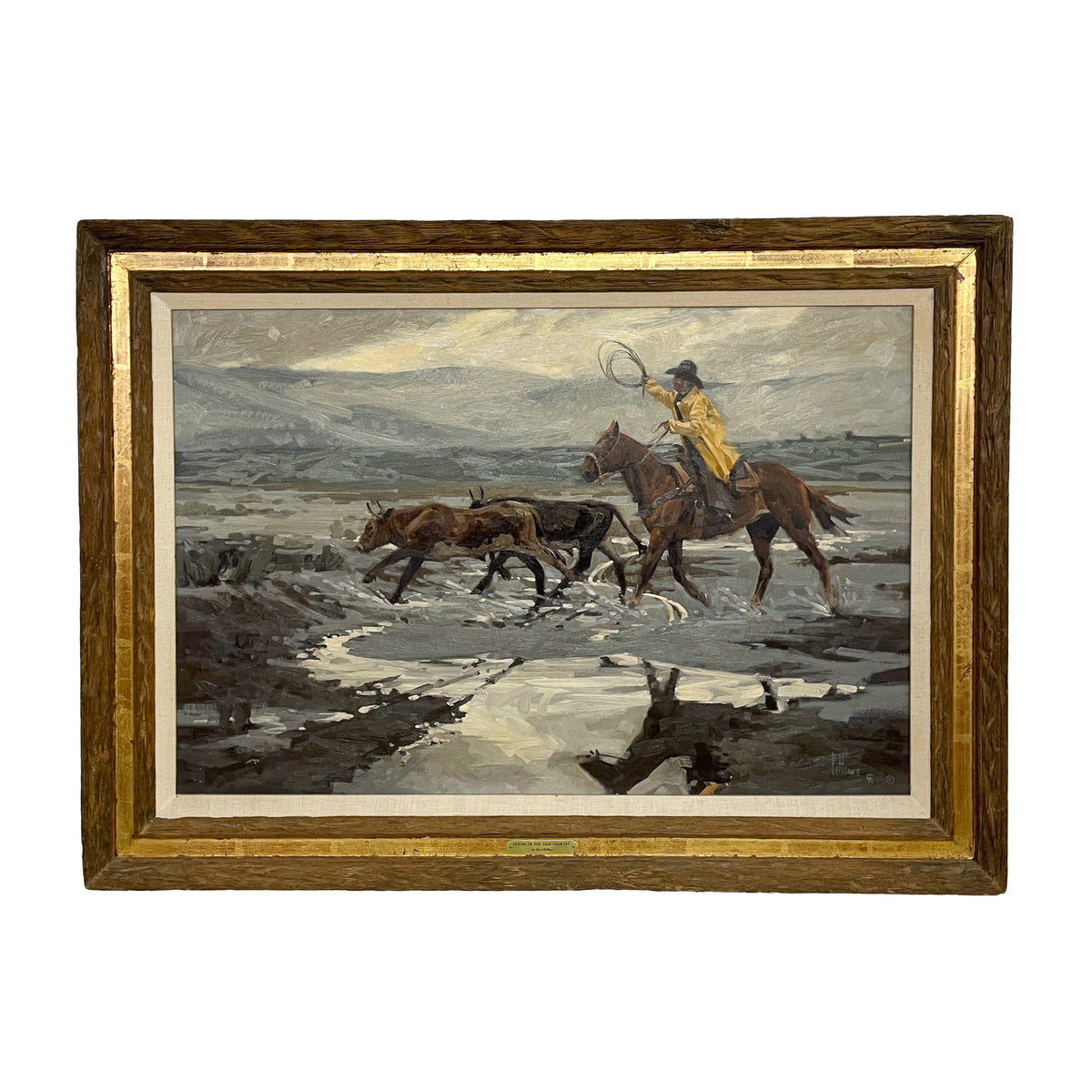 The painting is signed lower right and an engraved plaque to the frame titled "Spring in the High Country", also with the artist's label to the verso and housed in the original gilded barnwood style frame. This is a very strong & dynamic painting by one of America's greatest living Western/Cowboy artists, in excellent condition and ready to hang on your wall.