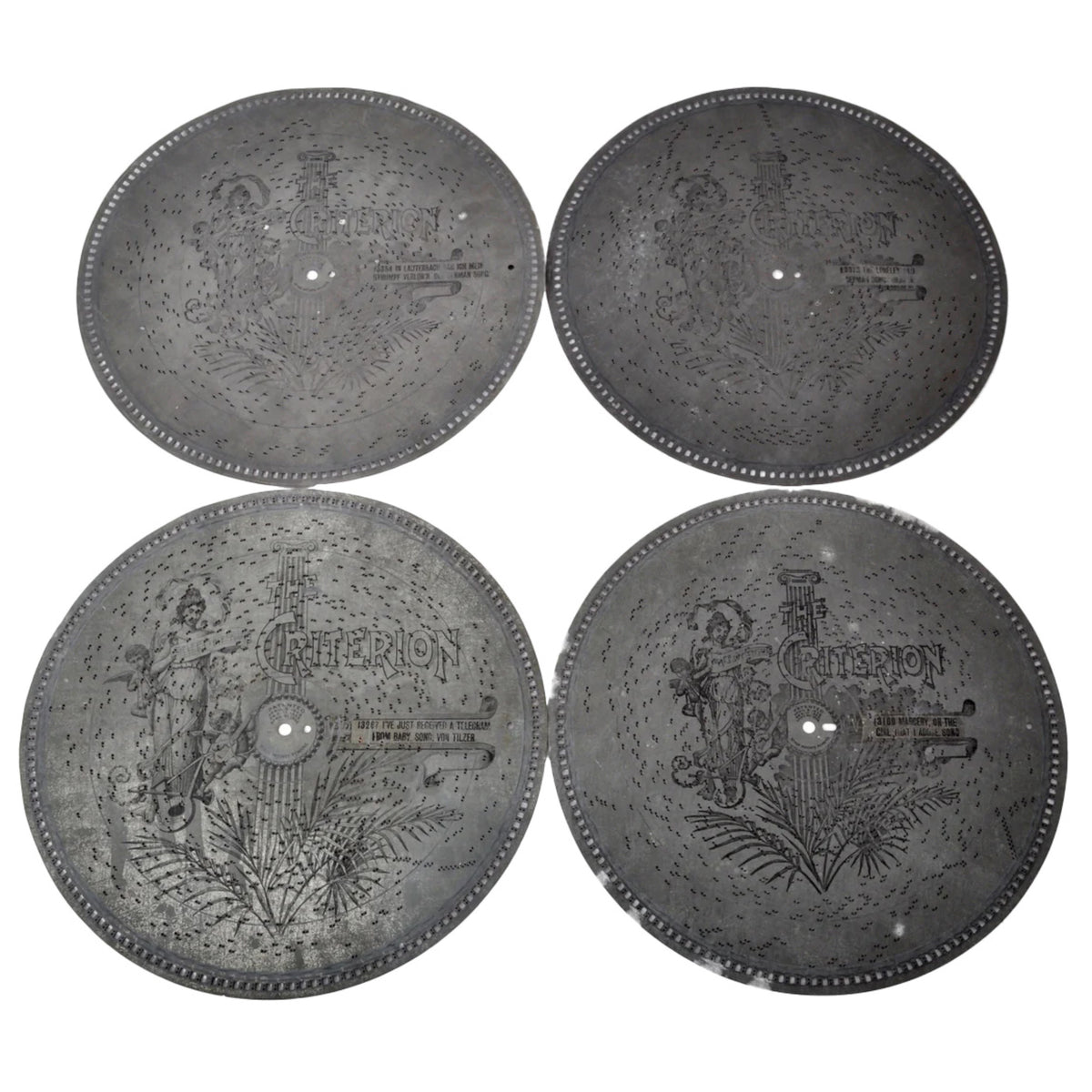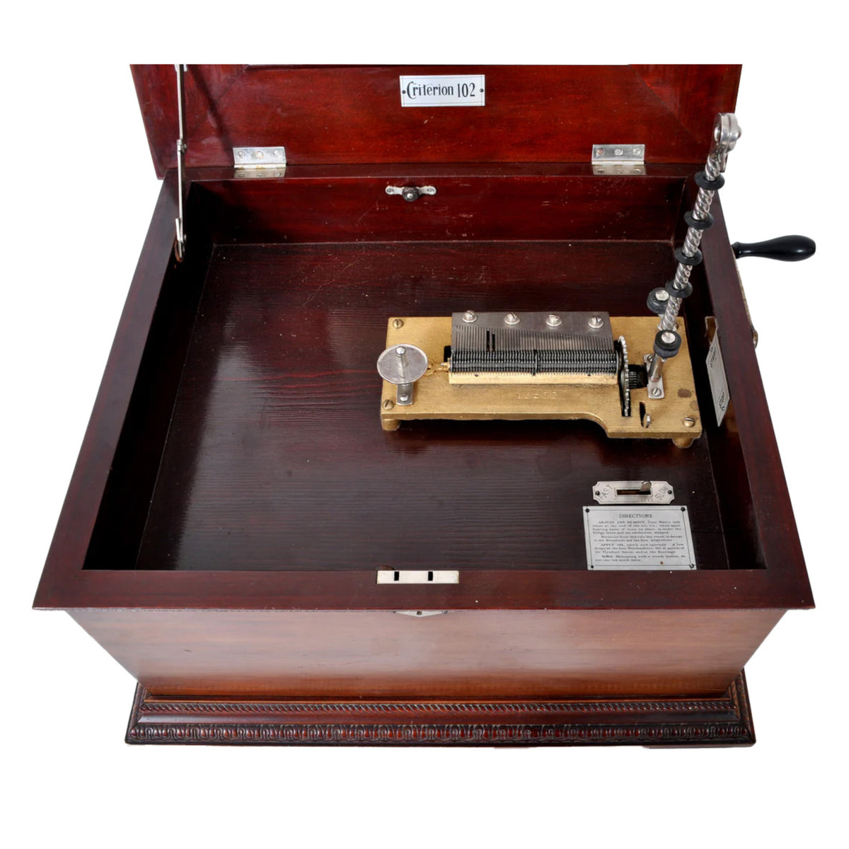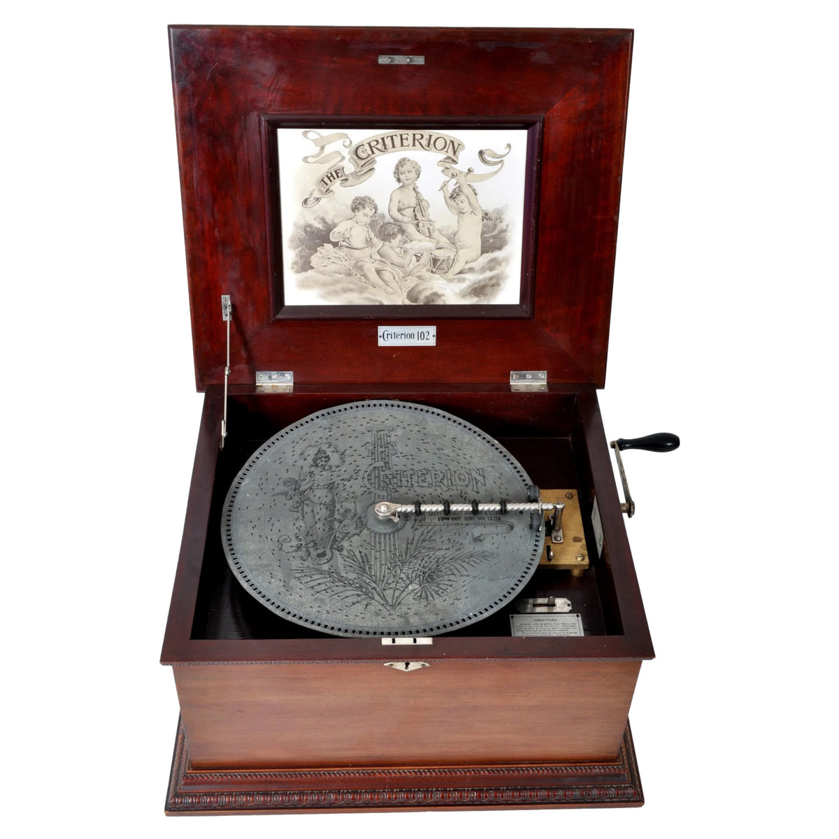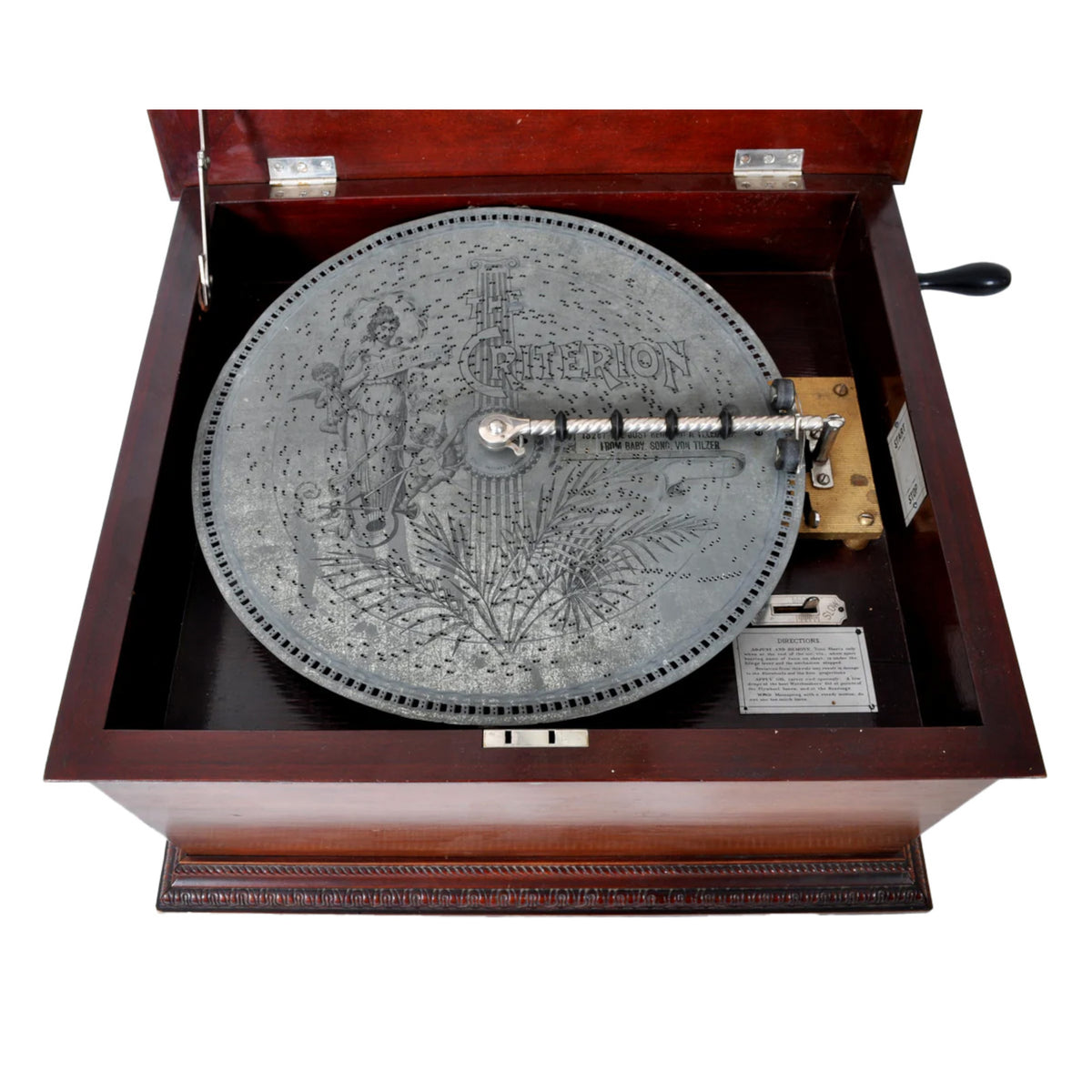 Antique 14" Disc Music Box in Mahogany Case by Criterion, Circa 1880. The music box includes four 14" discs.