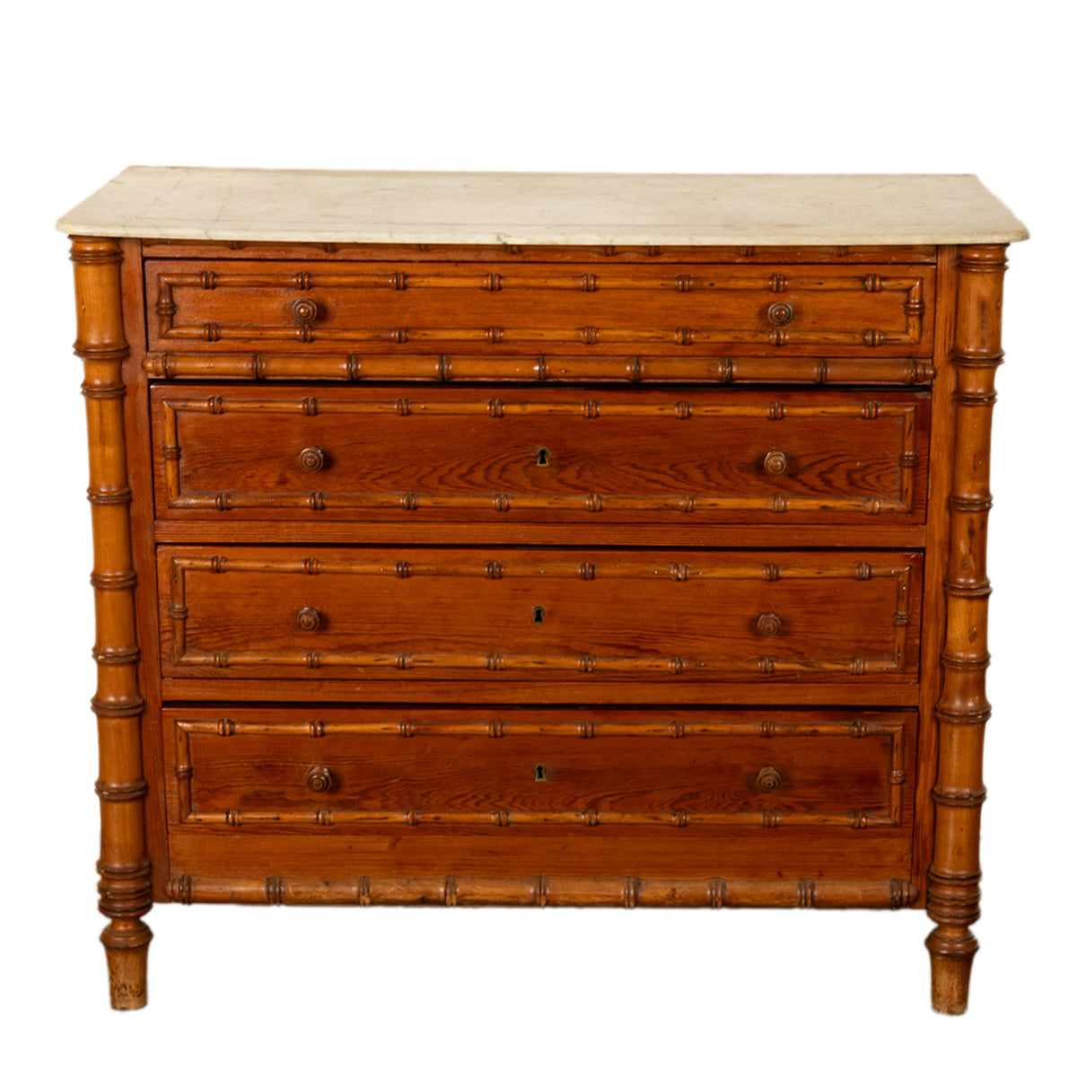 A good antique 19th century French Empire faux bamboo & white marble pine four drawer commode/chest of drawers, circa 1880.