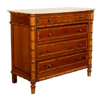 The chest having the original veined white marble top above four drawers, each drawer having twin turned pulls, the drawers open and close with ease and each drawer is decorated with a rectangular faux bamboo frieze.