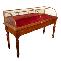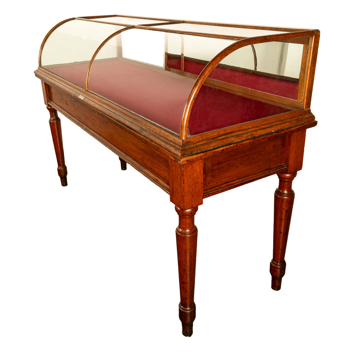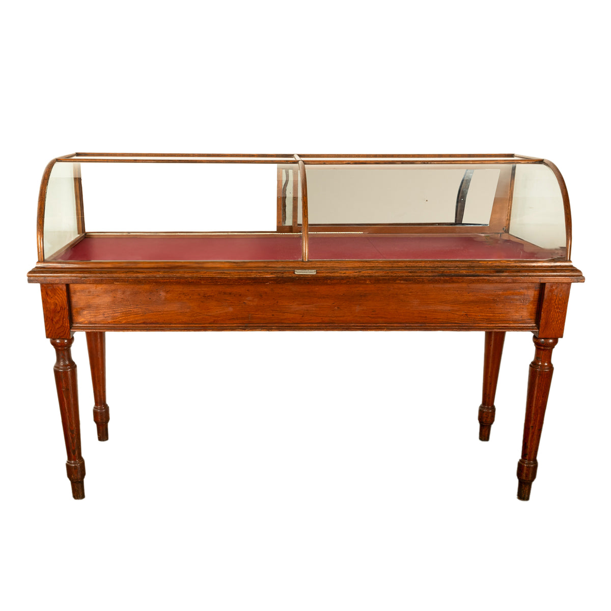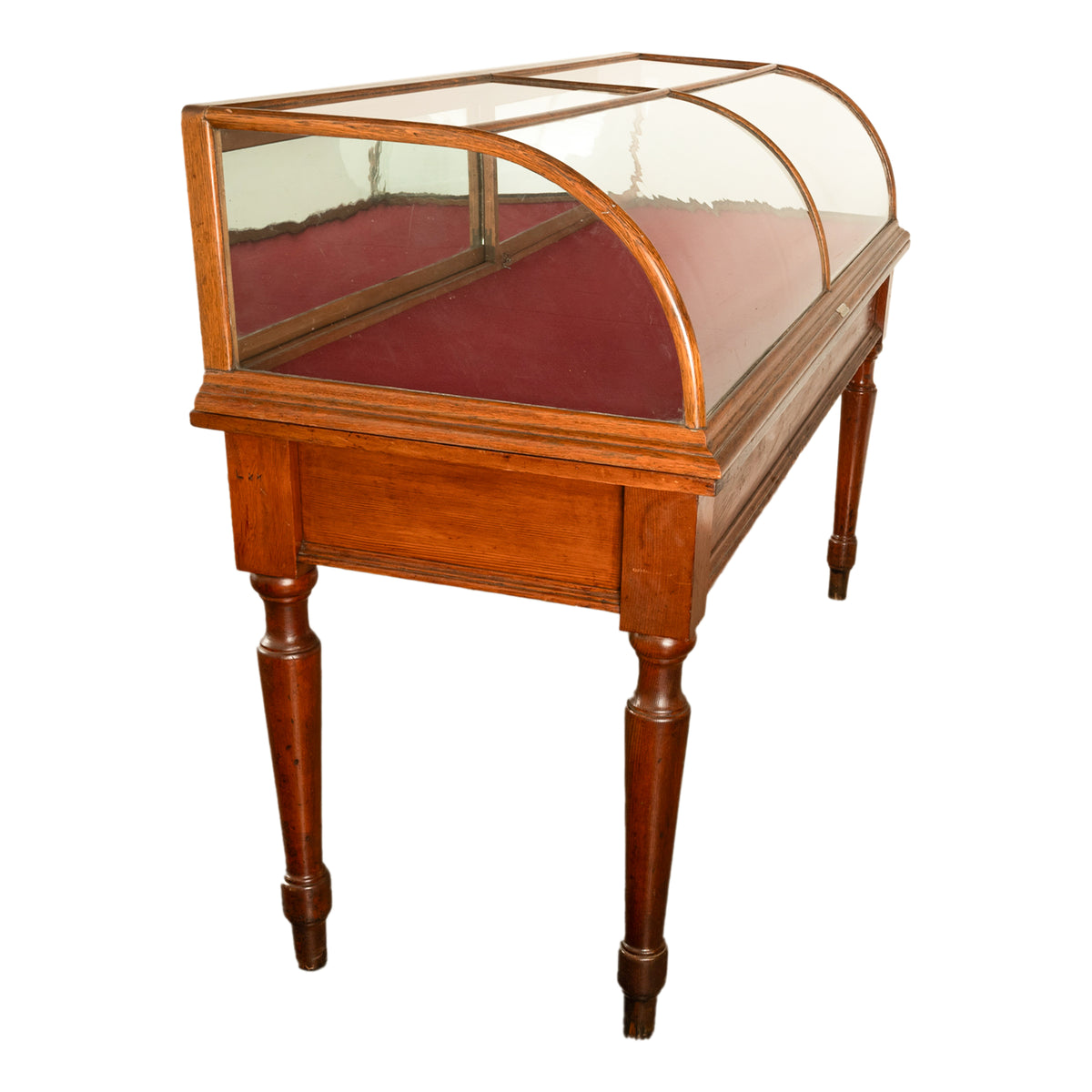 A rare antique oak and curved glass mercantile store display case and table base, R. Lutke & Co, Portland Oregon, circa 1895. (We currently have five identical cases in stock)
