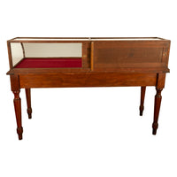The case and original table base stand are in two sections, the top display case having a pair of locking mirrored sliding doors to the rear, the case is lined with new red felt (which is on a board and is removable), the glass front having twin curved glass panels and glass panels to the sides and top, allowing items to be displayed from all sides.