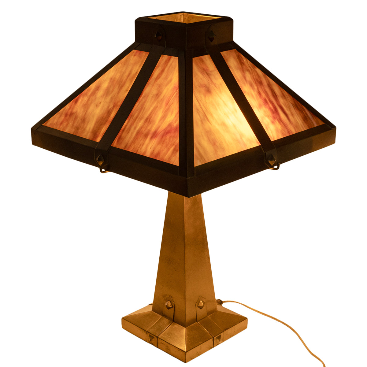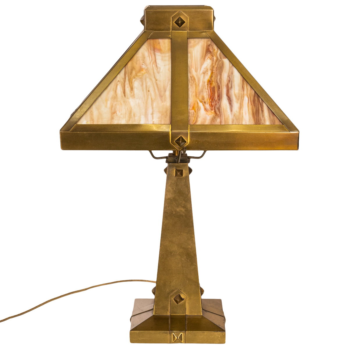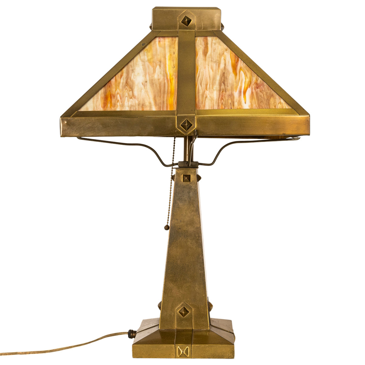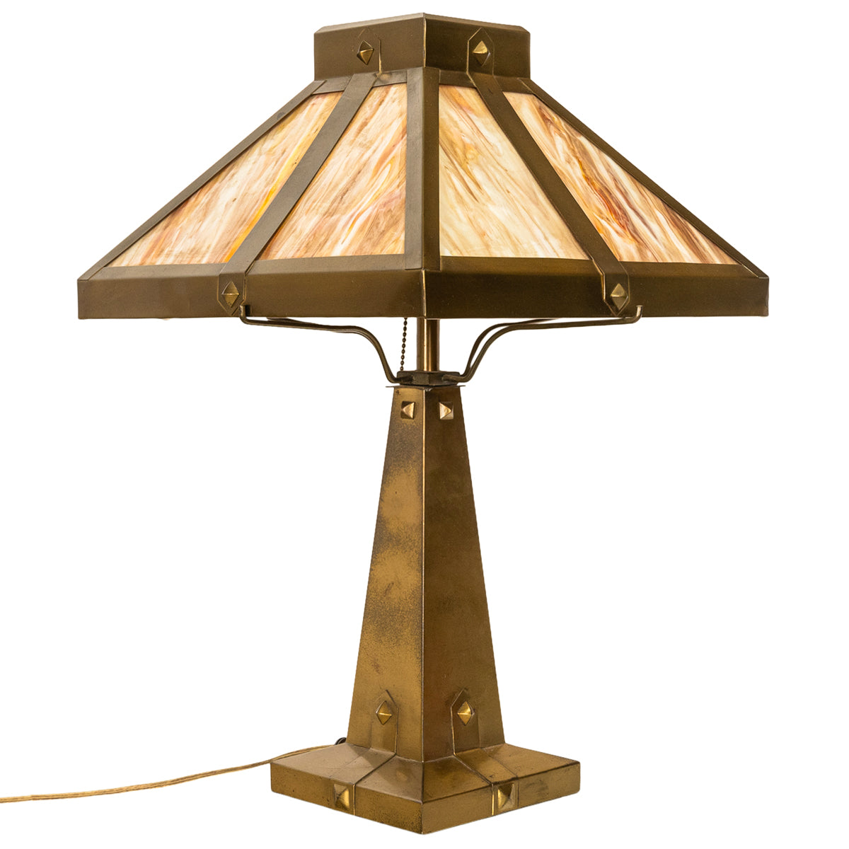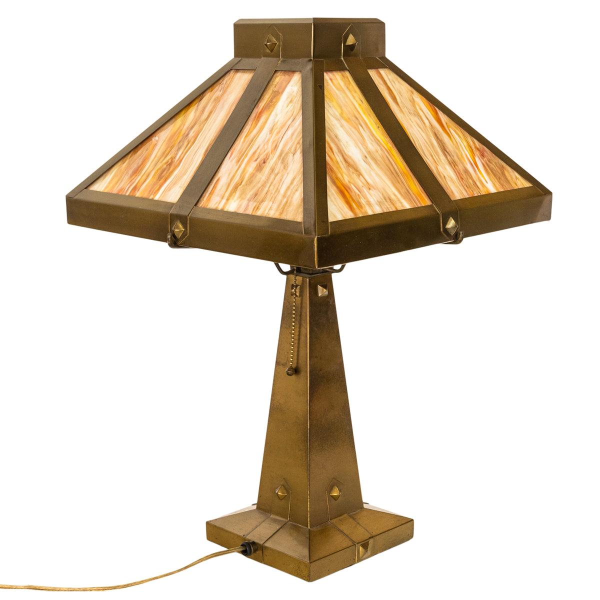 AS very good antique American Arts & Crafts, Mission, brass & slag glass table lamp, circa 1910.