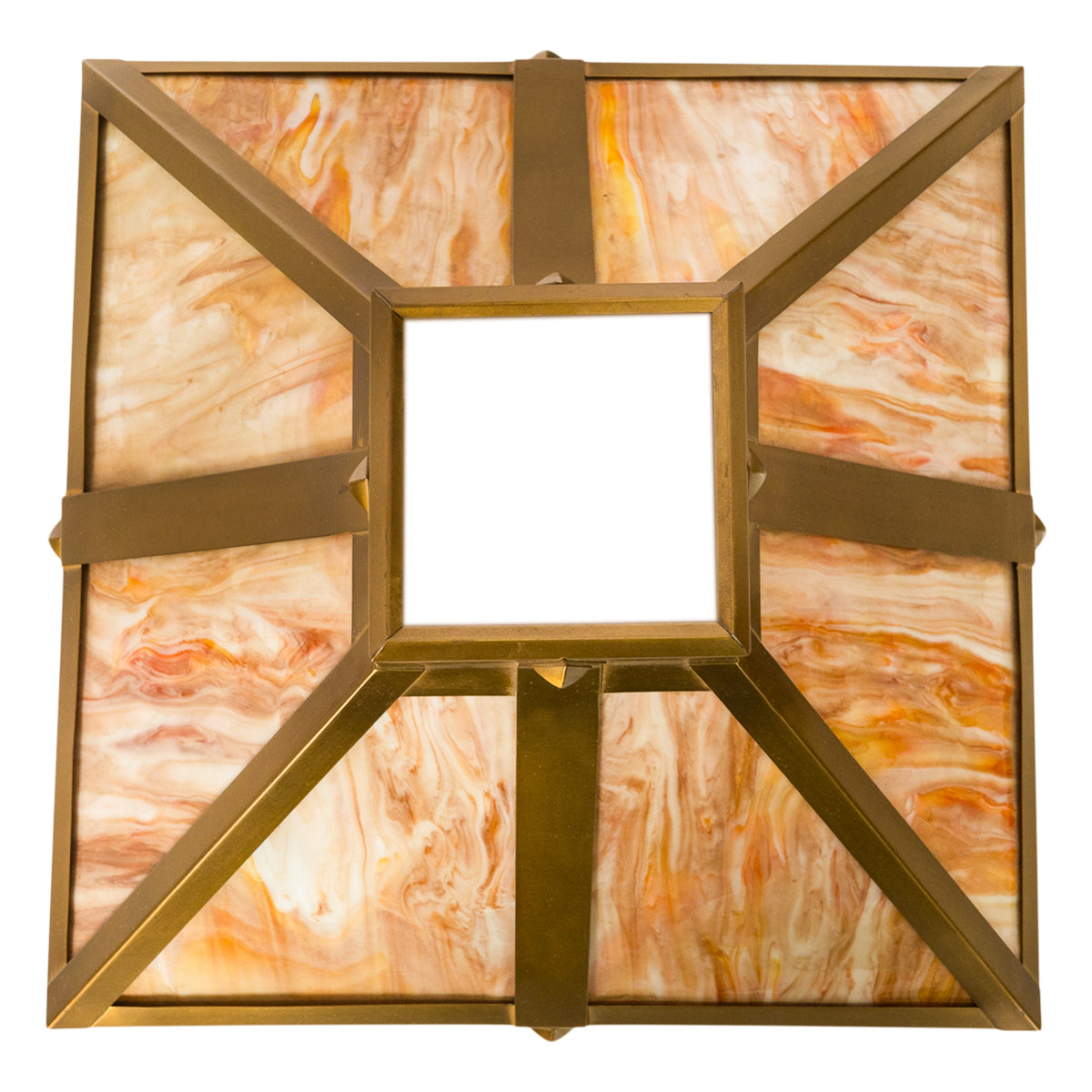 This very handsome twin light Mission lamp having a brass and variegated caramel & cream four panel slag glass shade, raised upon a corresponding brass tapered base. Both the shade & base having raised four sided decorative 'rivets', the lamp having twin pull chains to turn either light on or off.